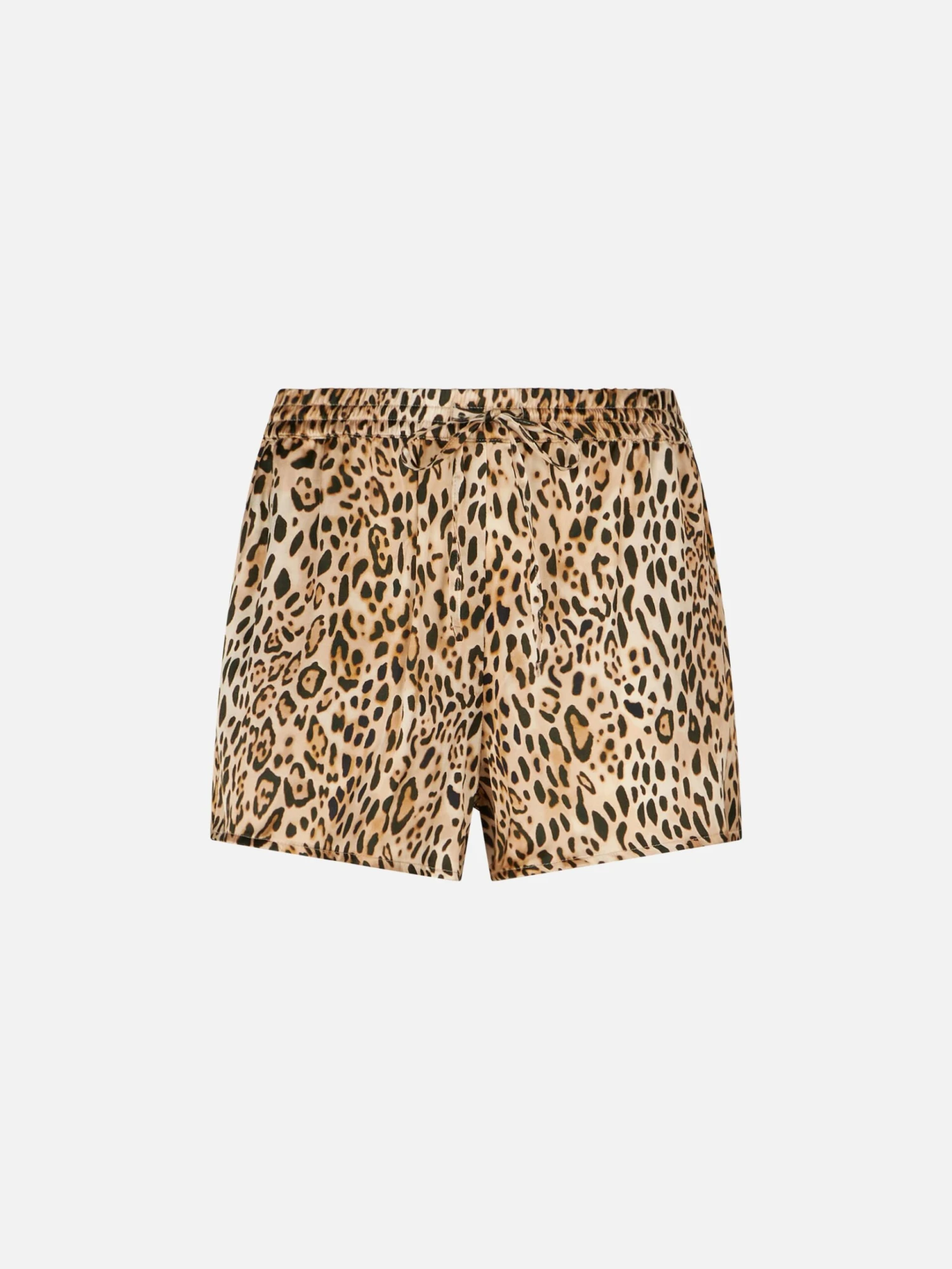 Beach woman’s horts, animalier leopard print, side pockets, elastic waistband with drawstring. Composition: 100% viscose