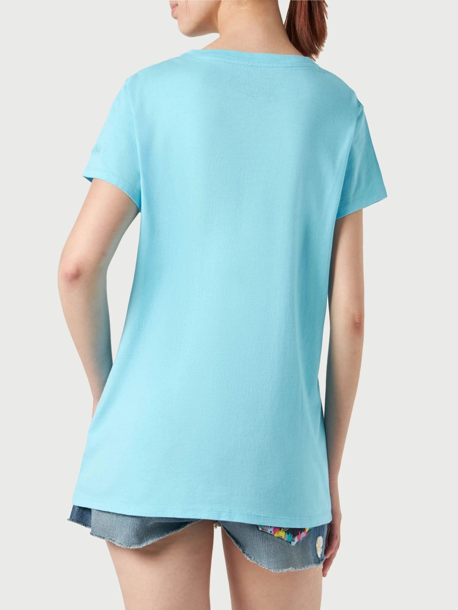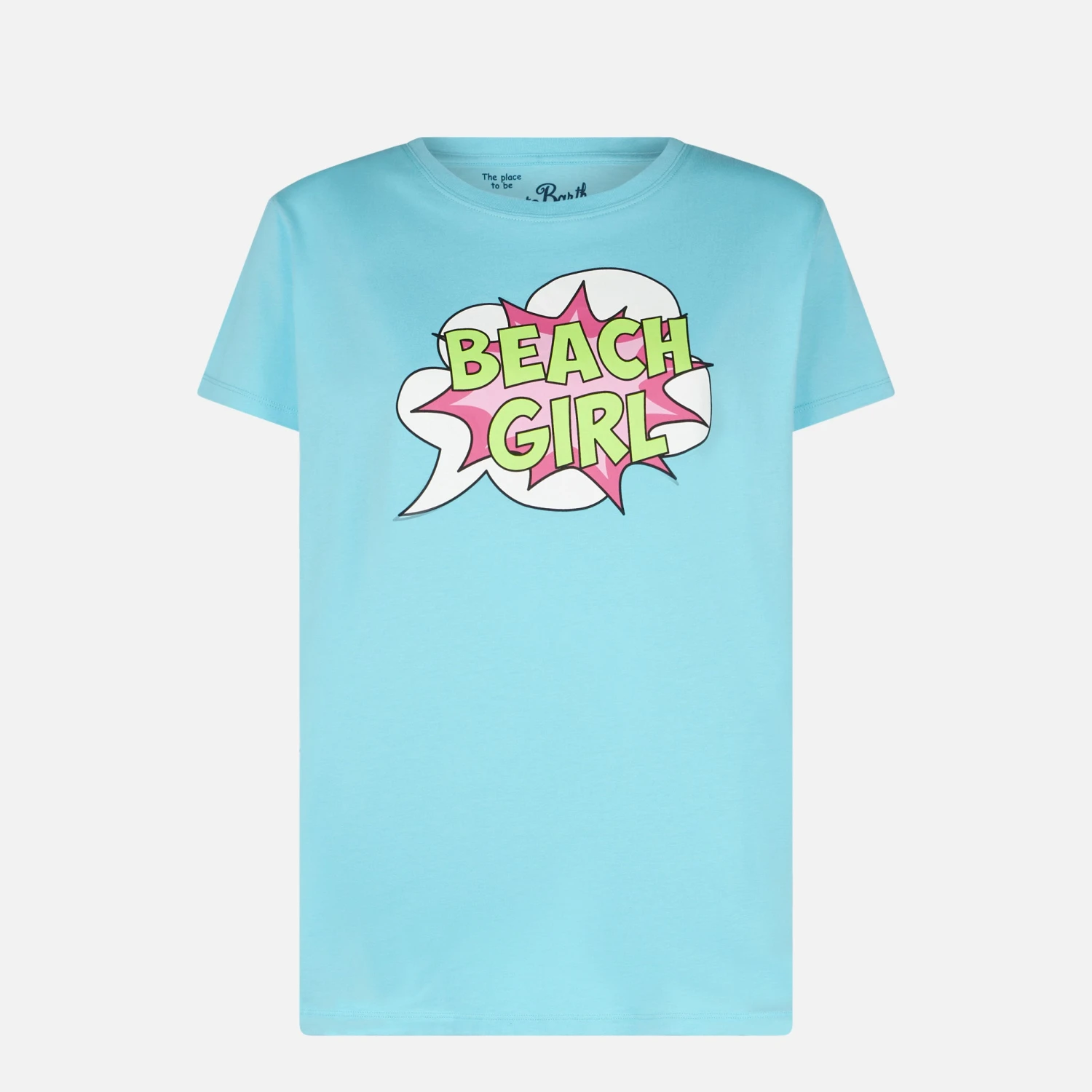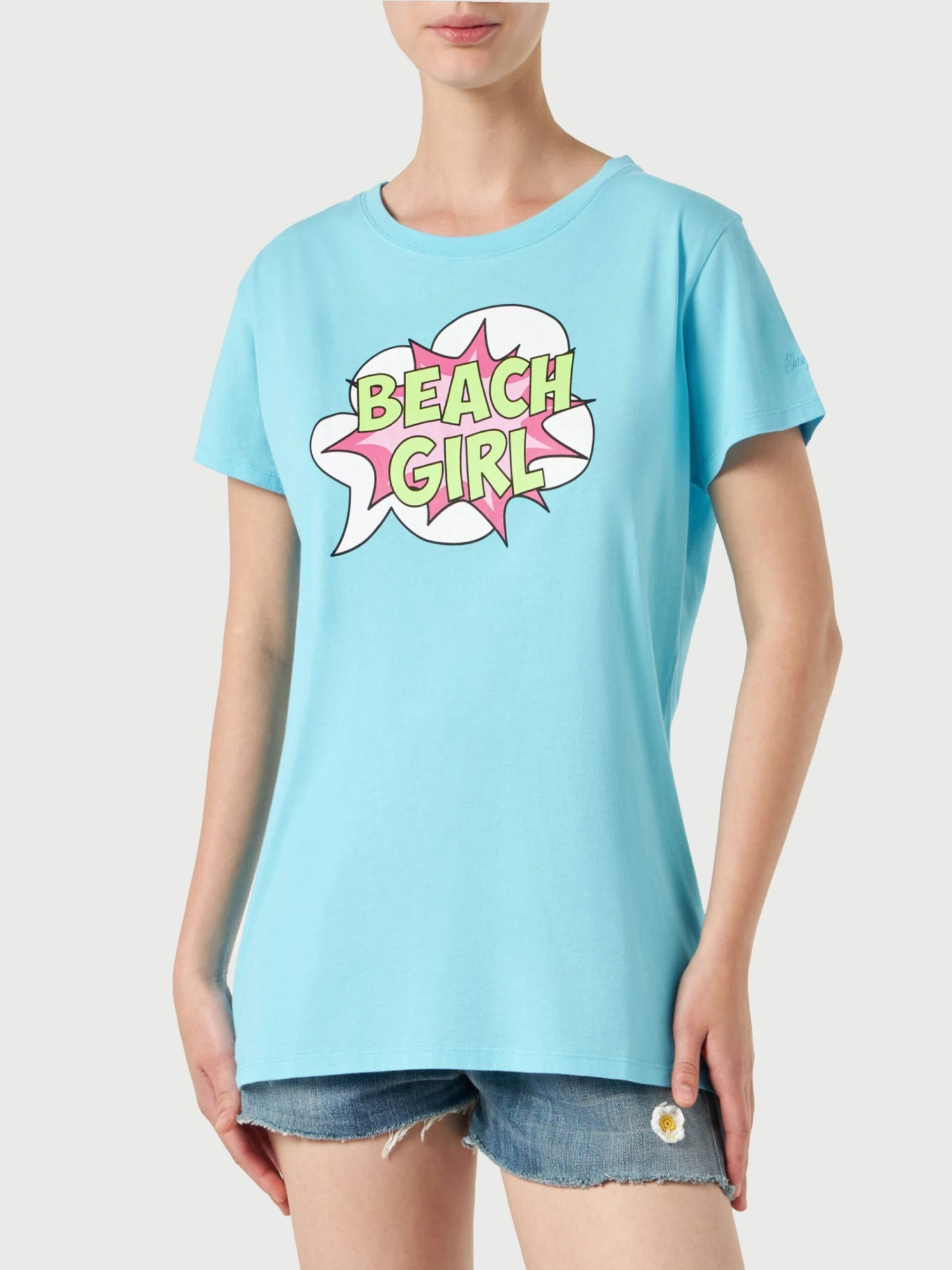 Women’s T-Shirt, Beach girl front print on light blue background. Crew neck t-shirt, short sleeve.