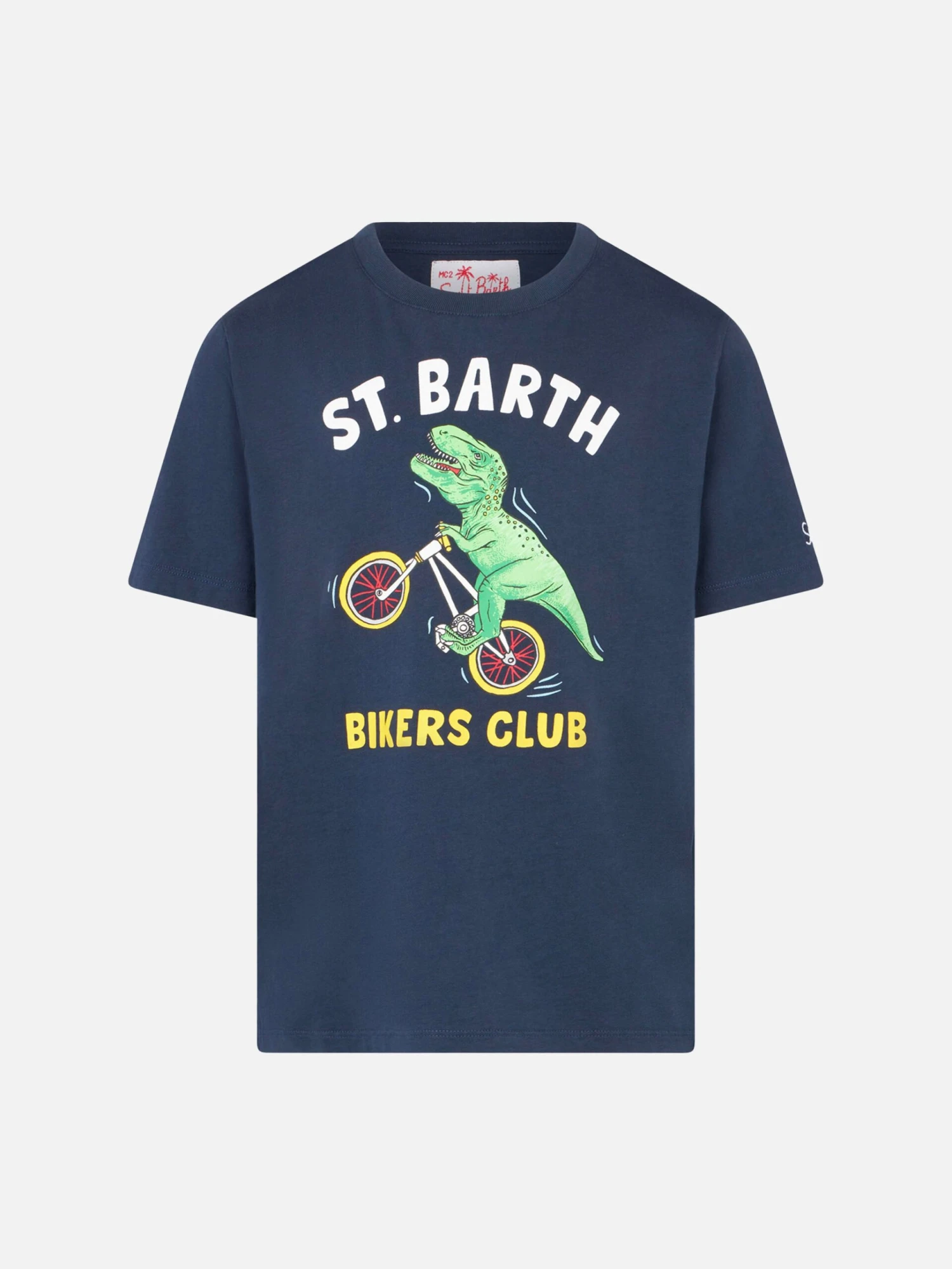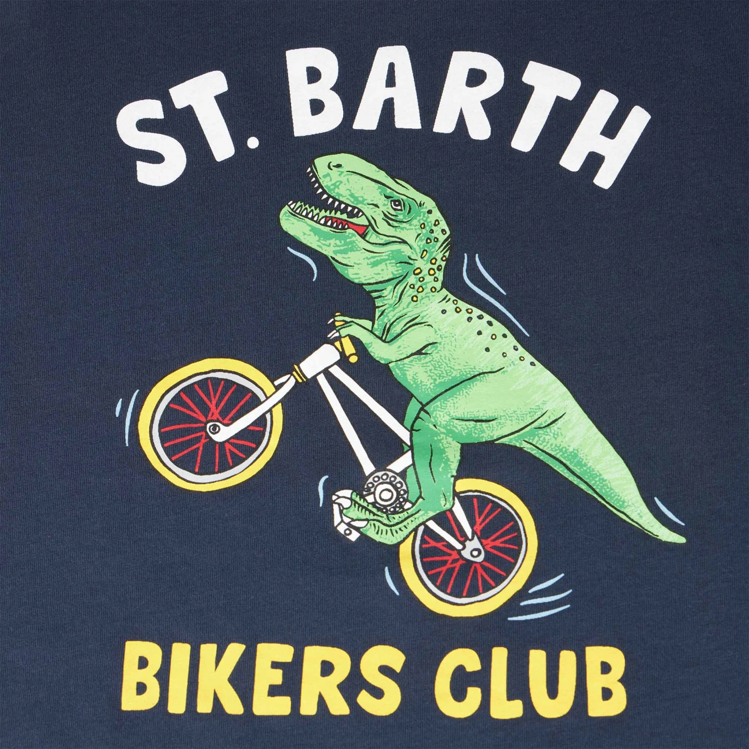 Boy’s T-shirt, biker dino graphic, regular fit, round neckline, soft blue cotton, short sleevs, styled in St. Barth. Composition 100% Cotton.