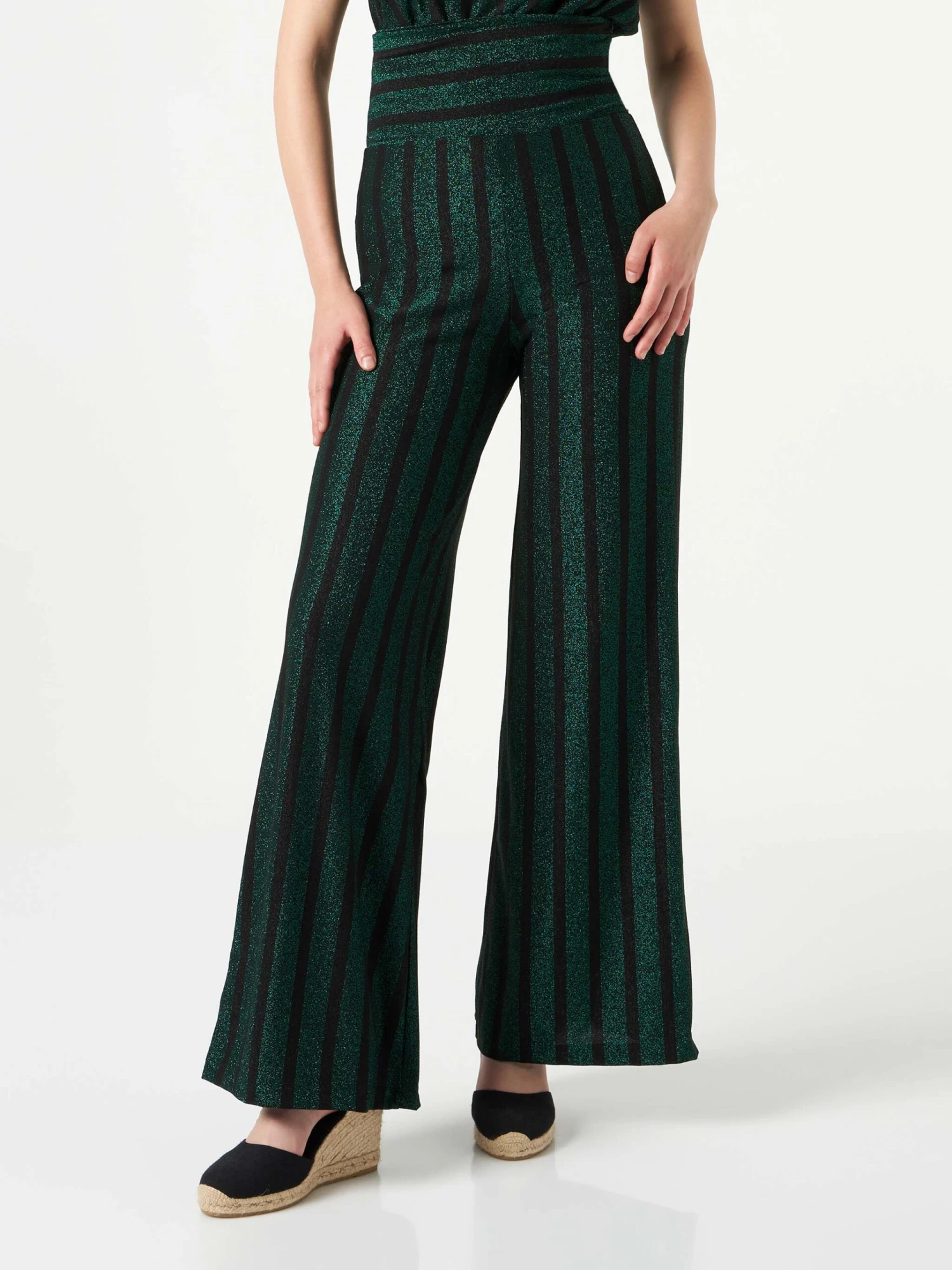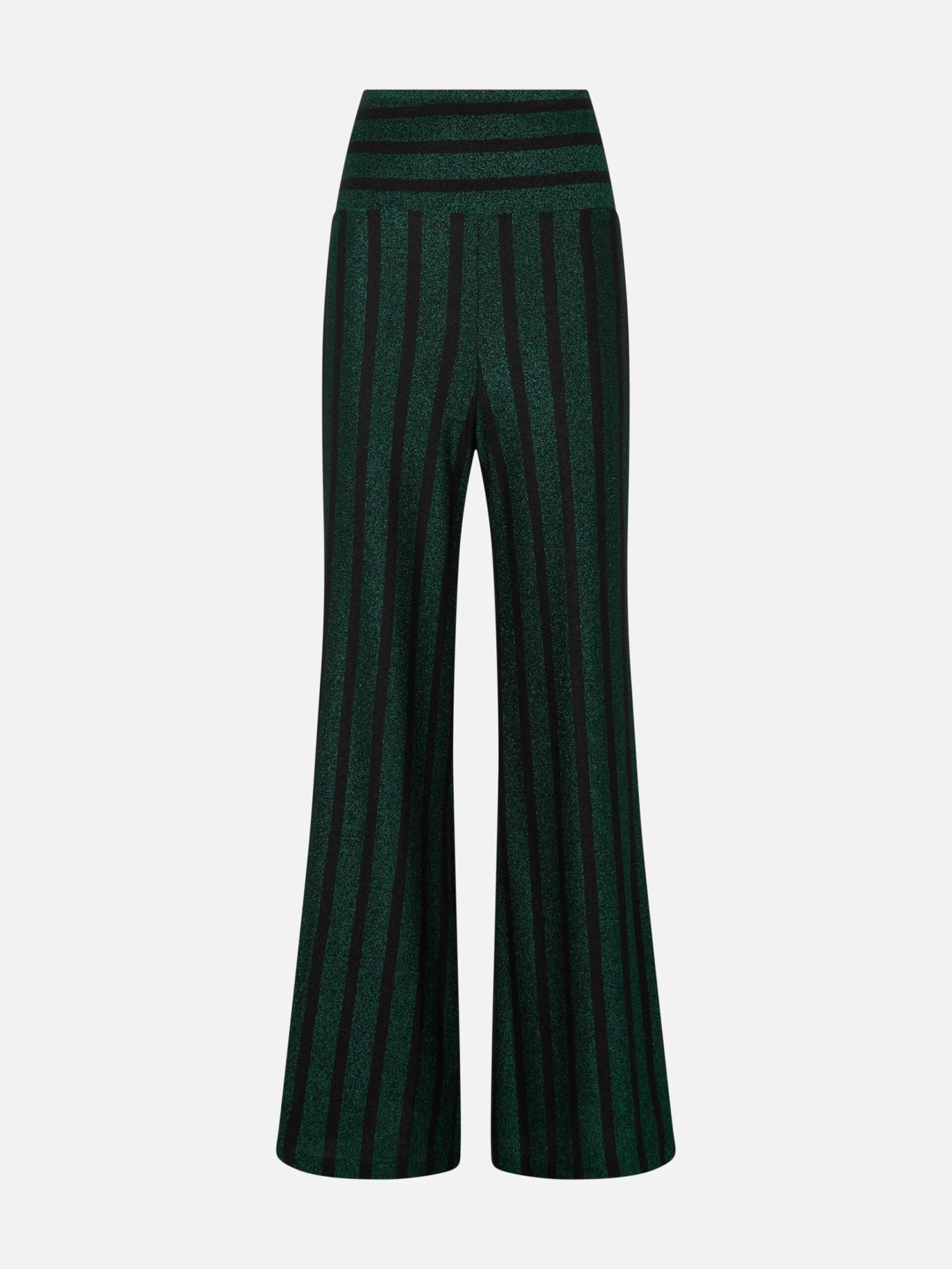 These palazzo knitted pants are perfect worn both with sneakers or heels, for a comfy chic style or an elegant event. Striped pattern in glitter black and green, they will make you feel glam in every mood. Straight leg, stretch knitted soft fabric, elastic waistband, mid rise, no pockets, lamè