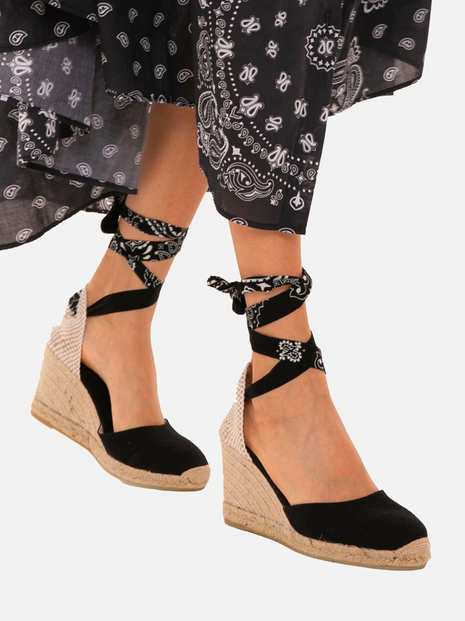 Black Print Canvas Espadrillas With Hight Wedge And Ankle Lace