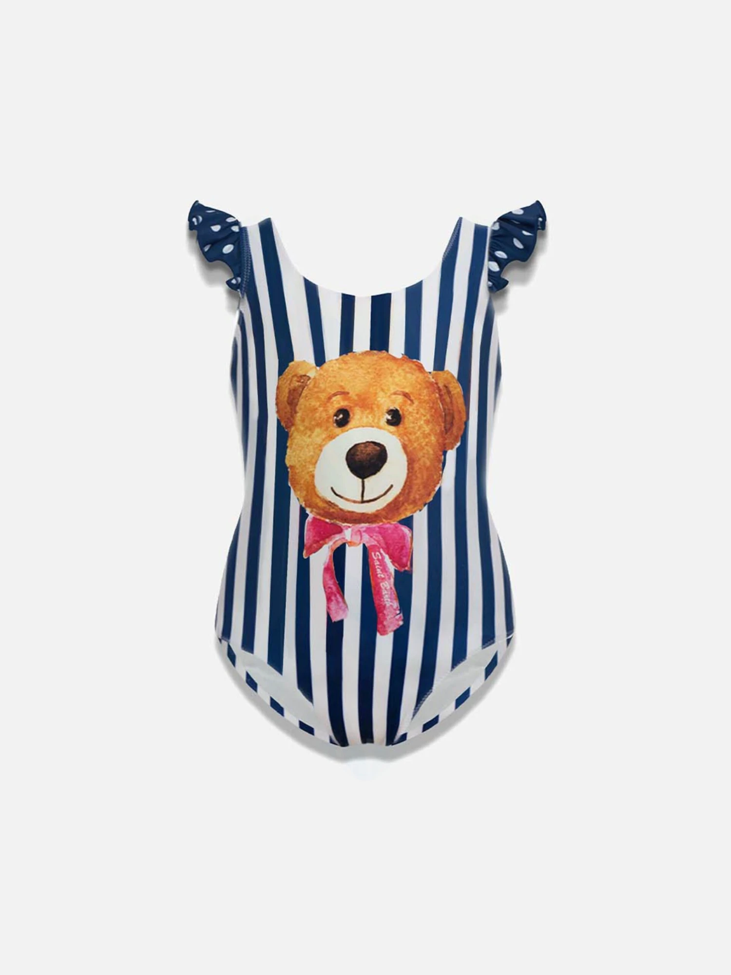 Ruffle Shoulder Little Girls Swimsuit, blue stripe all over pattern, front teddy bear print, shoulder straps cross over at the back, lycra fabric. Model Carol Museta.