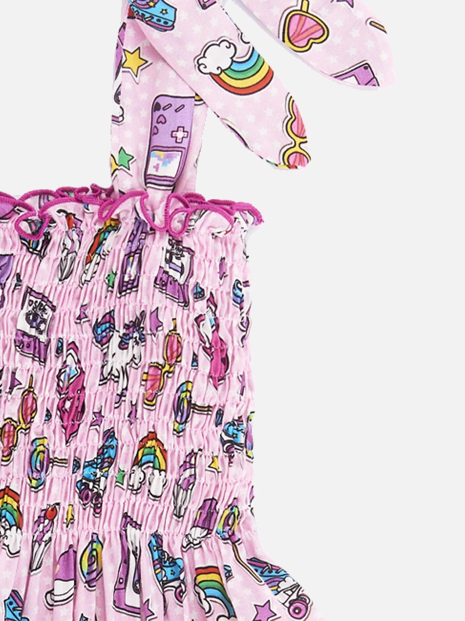 Summer Beach Dress for Girls, soft cotton muslin, multicolour all over print with unicorns, rainbows and little stars, fixed shoulder straps, elastic neckline, knee lenght dress. Composition: 100% Cotton.
