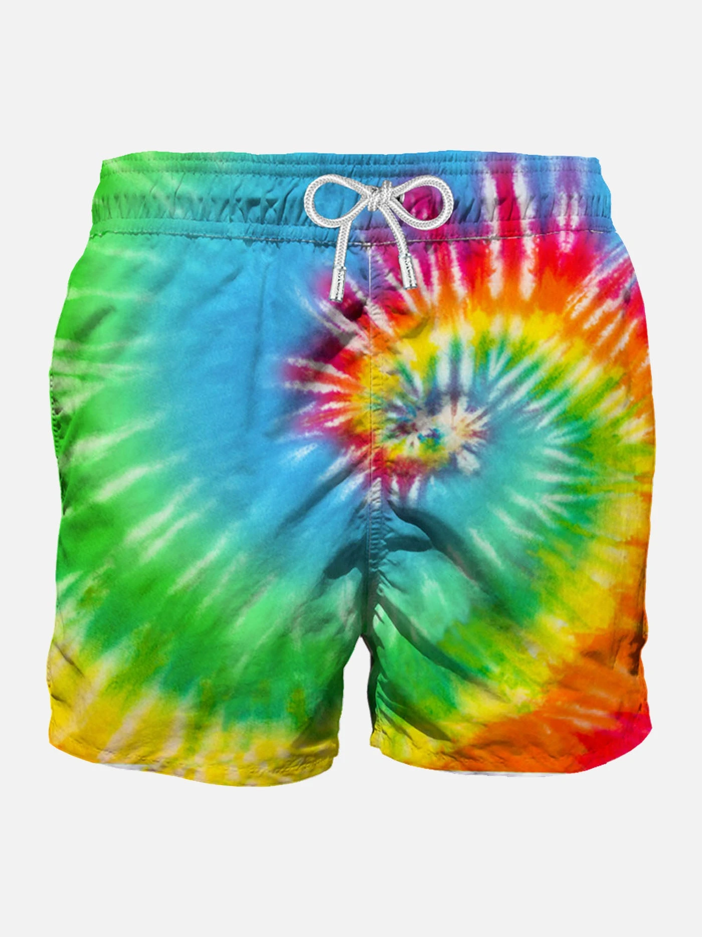 Fluo tie dye man swimshorts, mid-length, regular fit, elasticized waist, comfortable drawstring waist, inside ergonomic brief, drawcord closure, pockets on the sides.