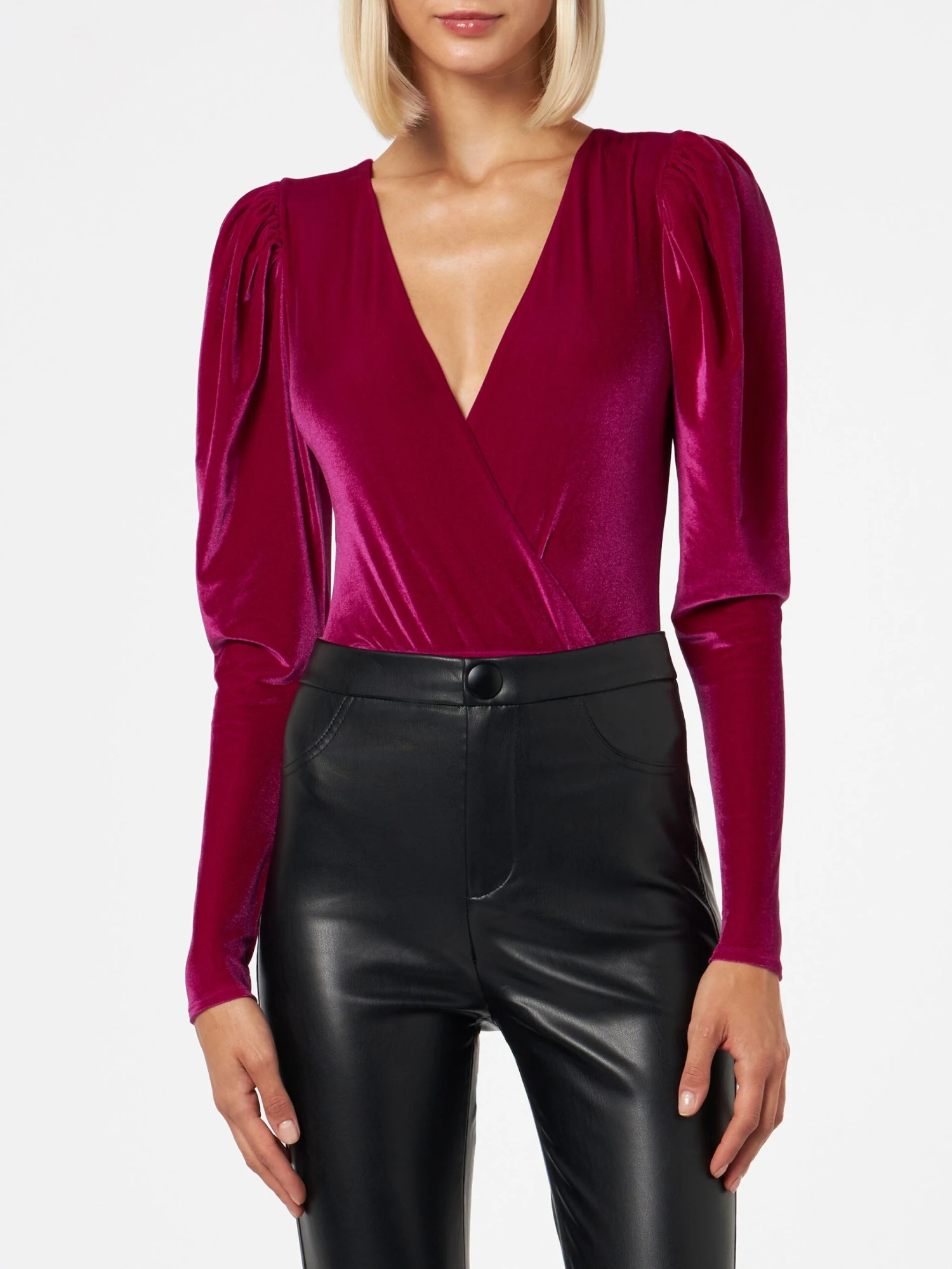 Bodywear and one piece swimsuit, v neck in front and on the back, fucsia velvet fabric, stretch fabric, lycra lining, regular fit. You can wear it as swimsuit in your summer beach and pool days, or as a bodywear to light your evenings.