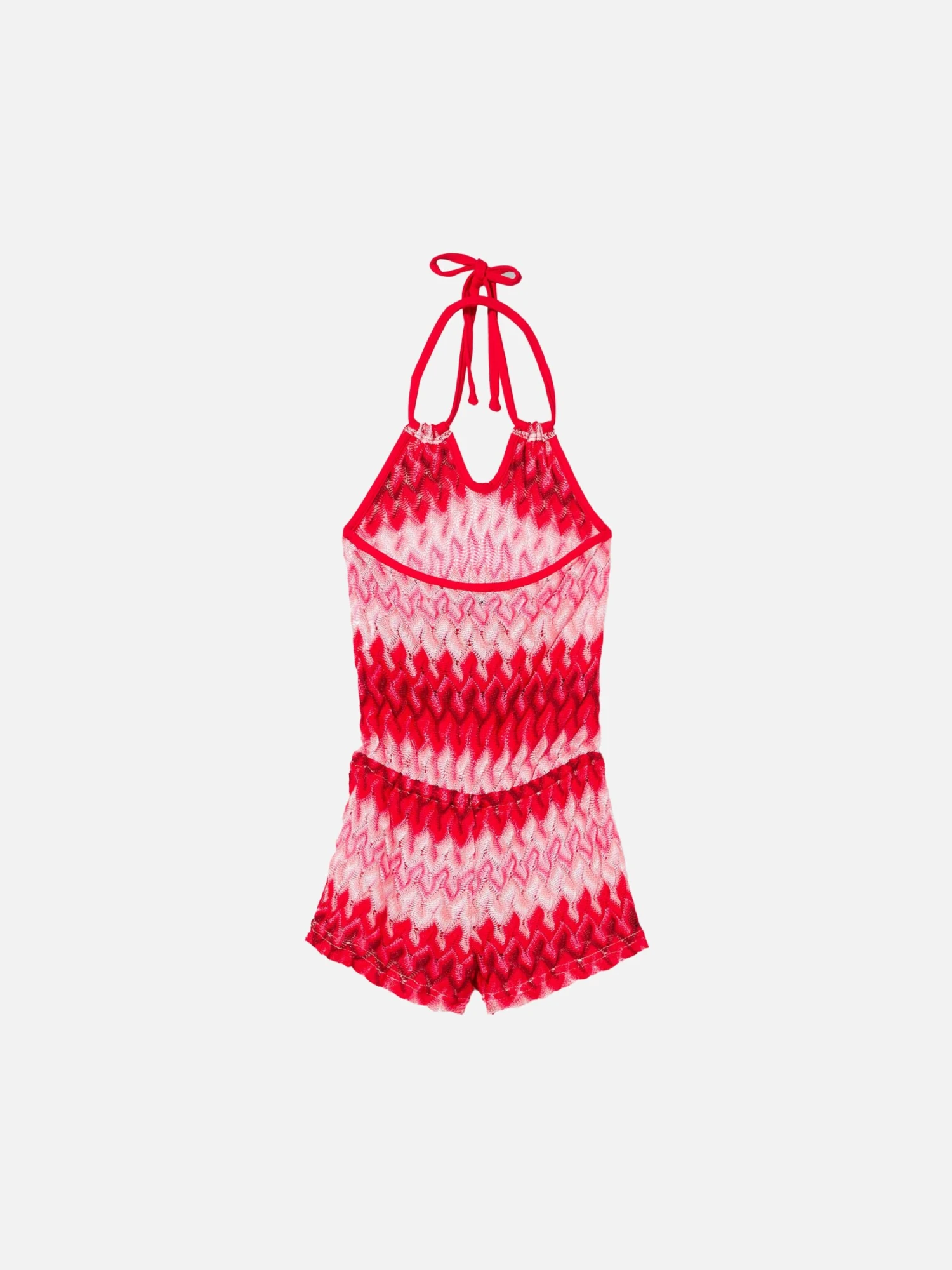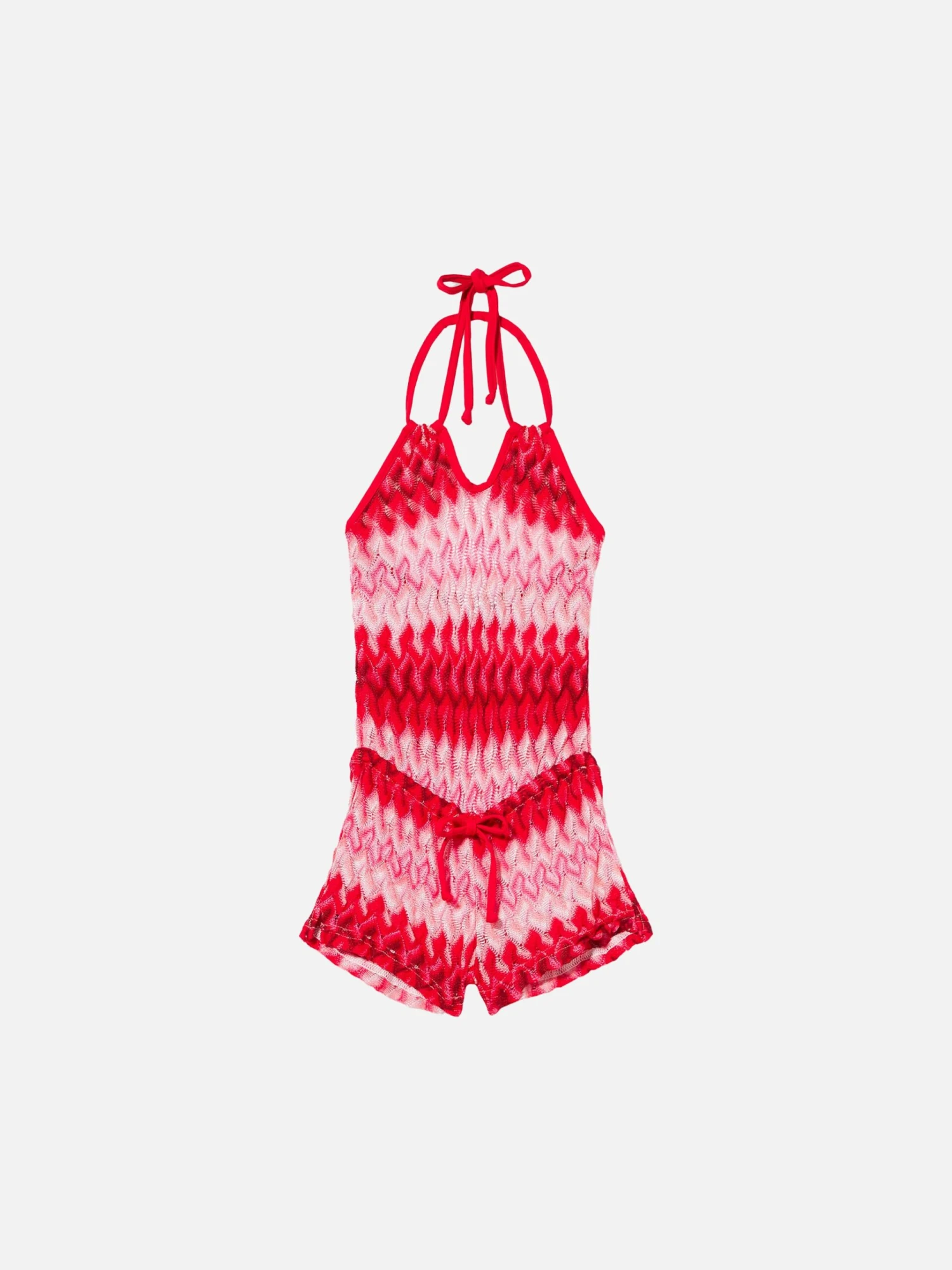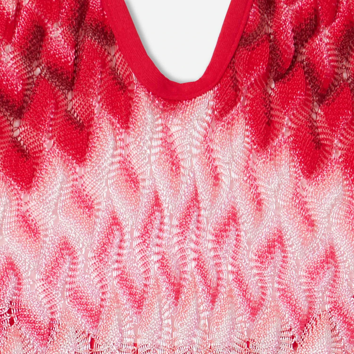 Model Lea X0012. Summer Beach Dress for Little Girl,  Knit multicolour zig zag, elastic waistband with drawstring, Sleeveless. Made in Italy. Composition: 100% Viscose.