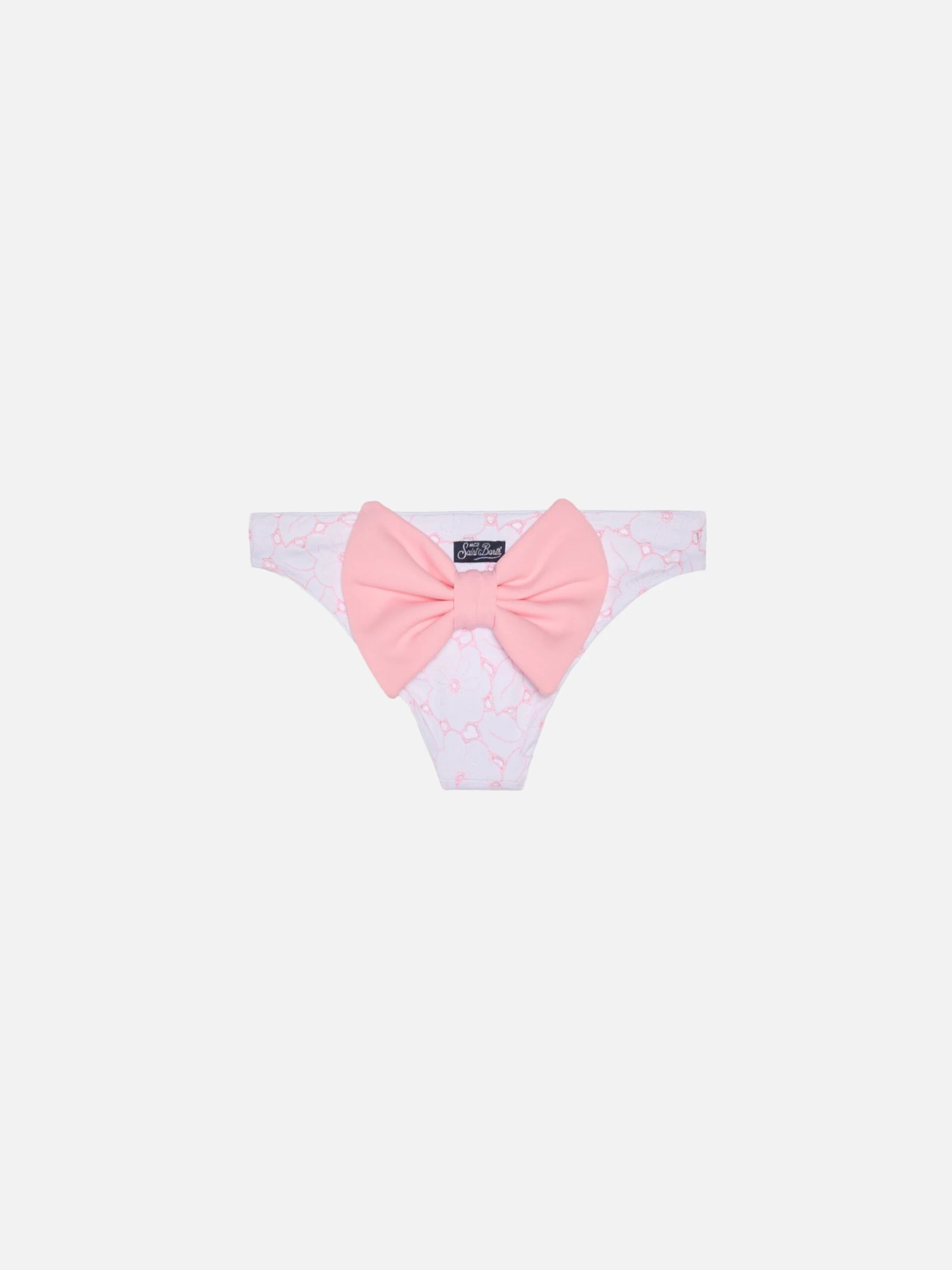 Little girls swim bottom, pink flower embroidered, lycra fabric. big pink bow at the back, close sides.