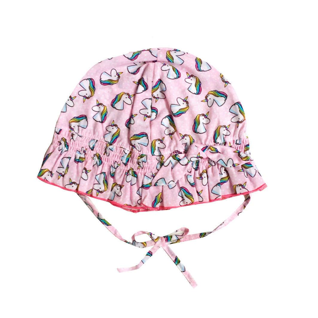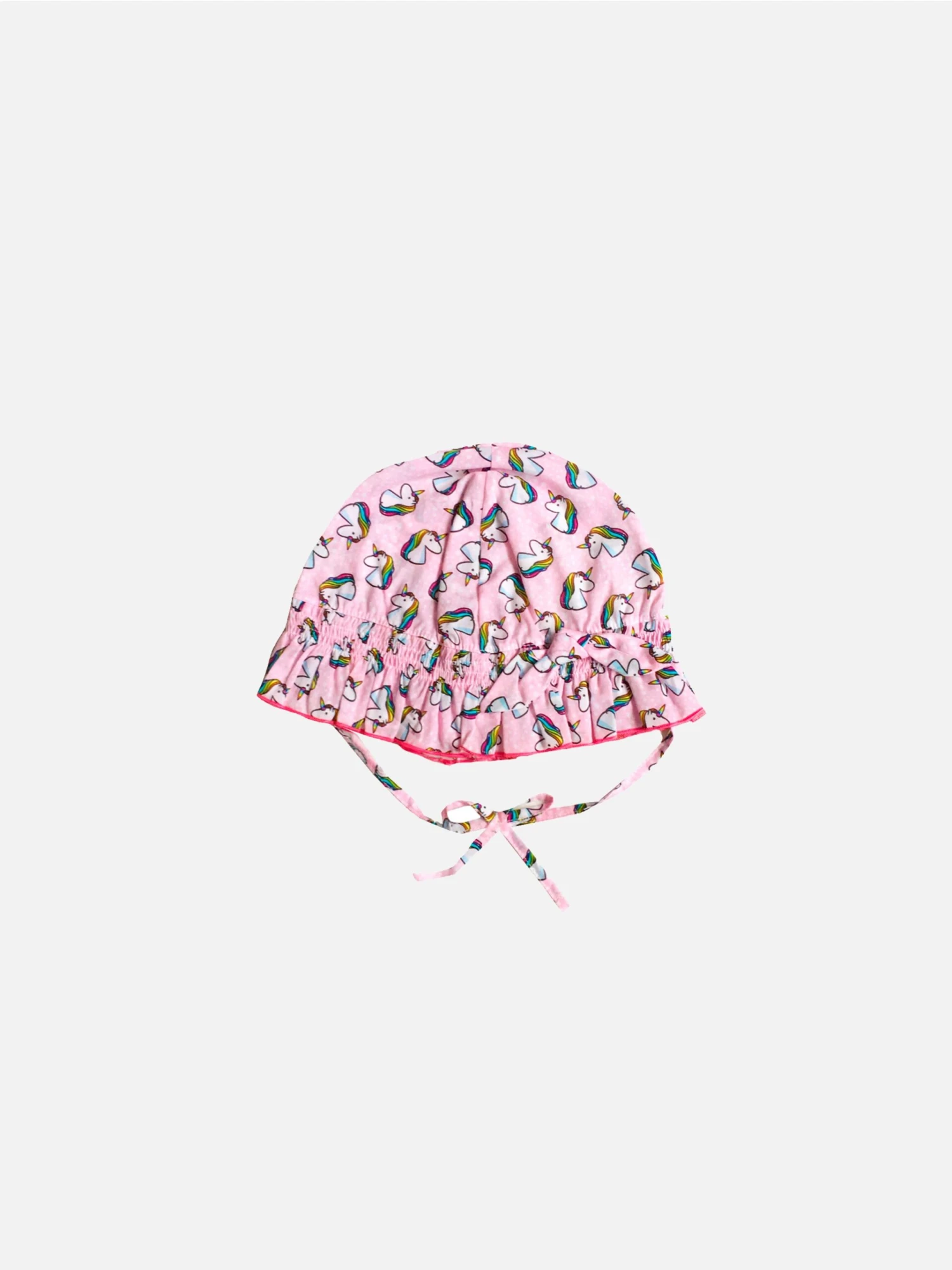 100% Cotton Bonnet for enfant, unicorn print. Laces with bow.