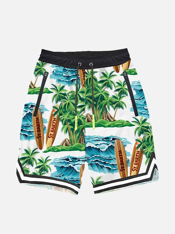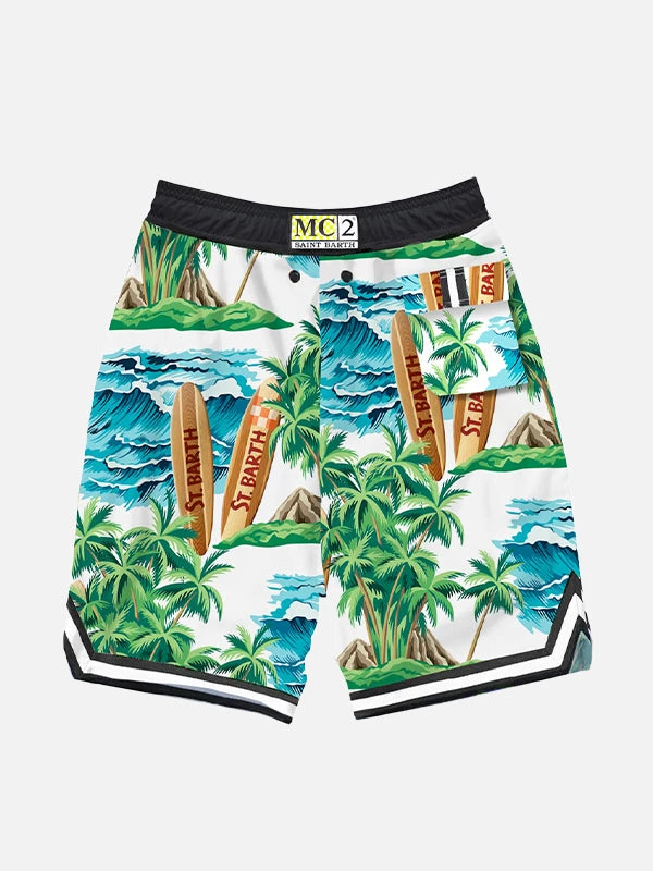 print with surfboards, waves and palms on a white background, medium length, quick drying, light mesh lining, elasticated belt, drawstring closure, front pockets with zip and back pocket with velcro.