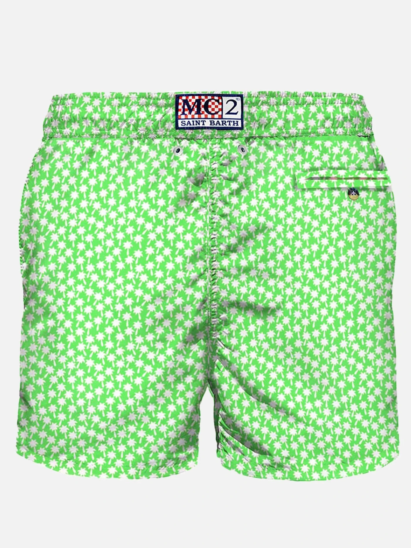 MC2 Saint Barth man’s swim shorts, micro palms all over print on light green backcloth, light fabric, quick drying, mid-lenght, light net lining, elasticated waistband, drawstring fastening, front and back pocket with summary.