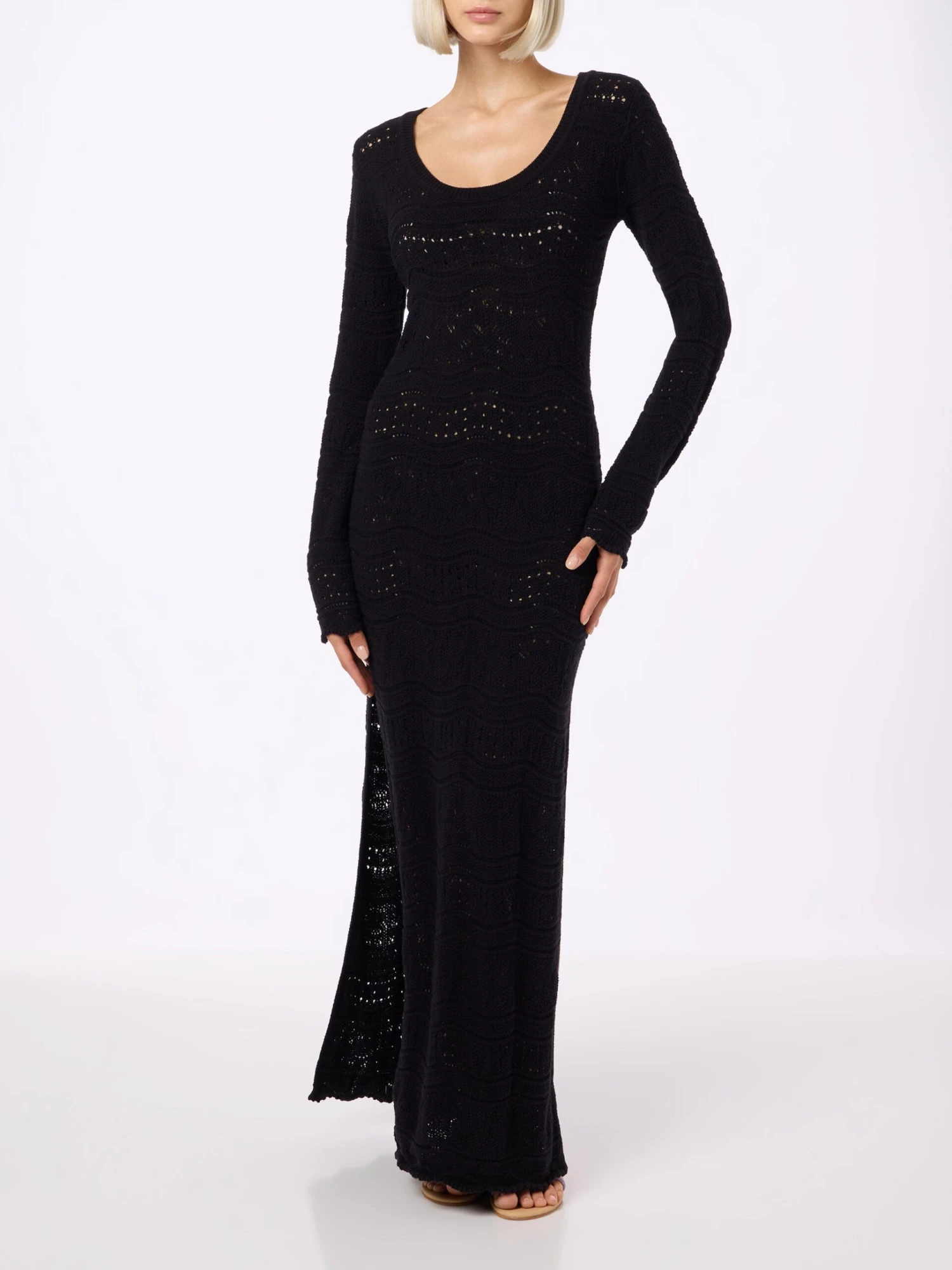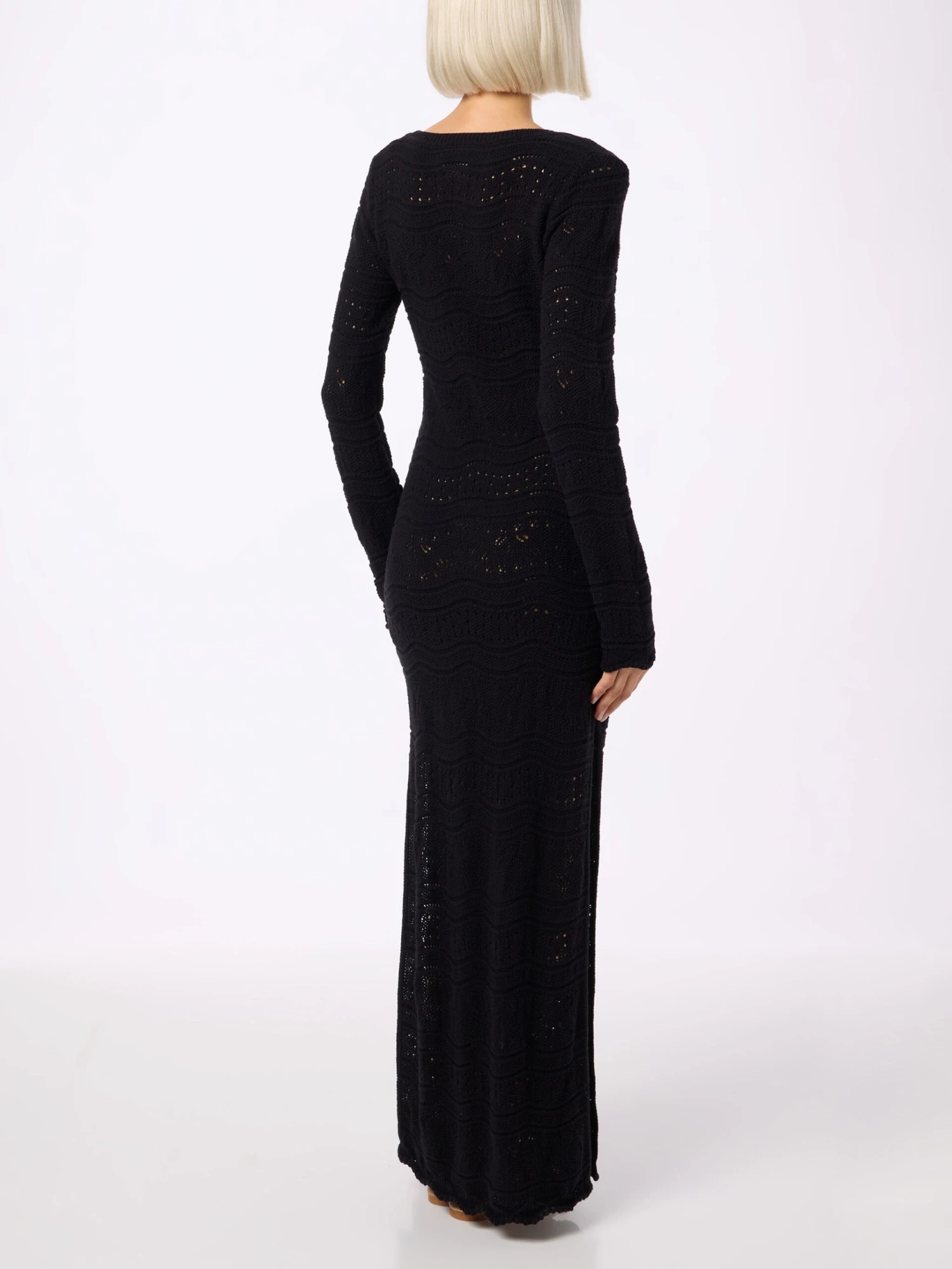 This black dress is knitted with airy lace patterns throughout, then finishes the cuffs and midi hem with charming scallops. It’s the perfect garment to enance your femininity with ease and comfort