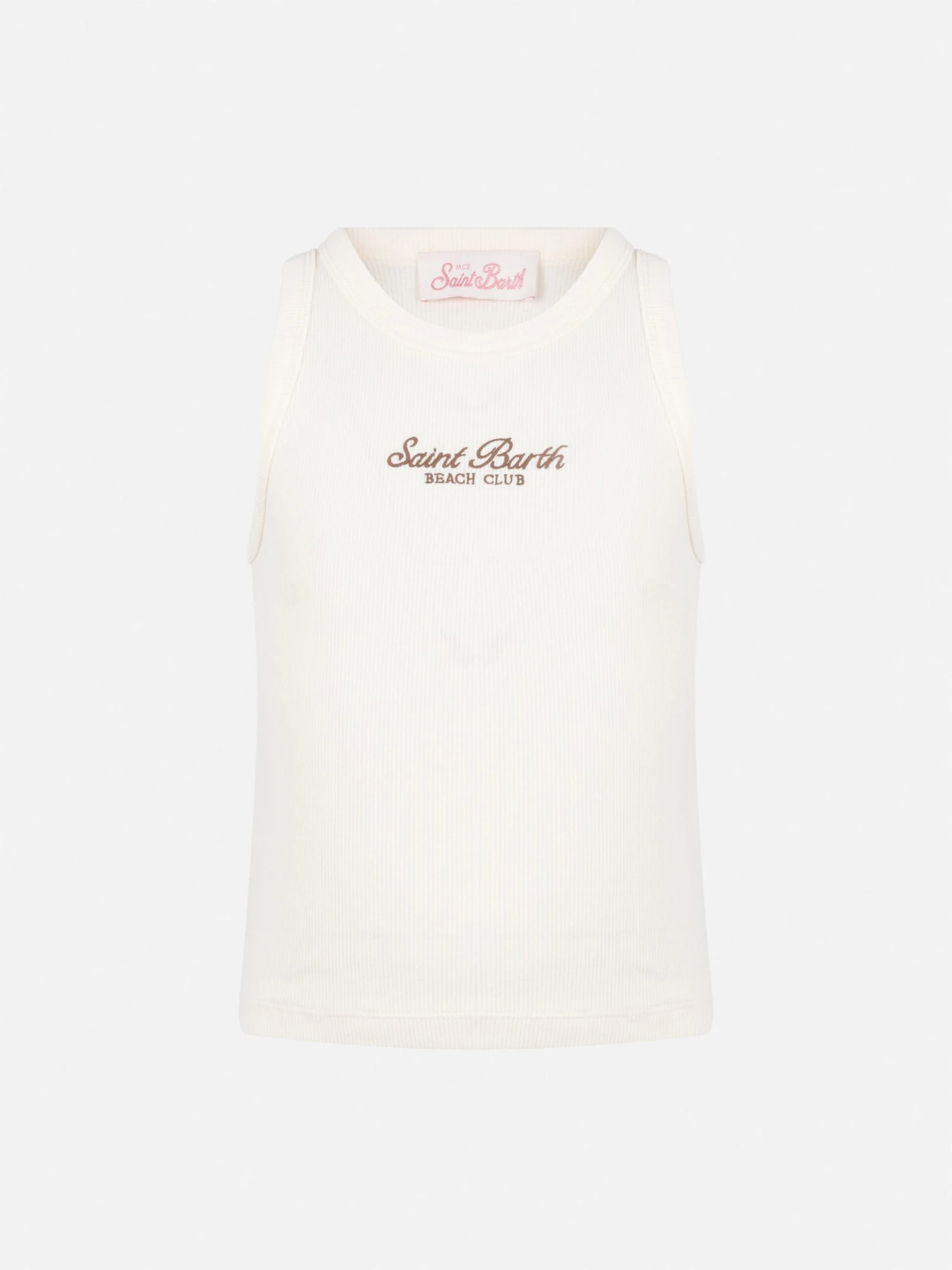 MC2 Saint Barth Blue Jr Off-white Rib-knit Cotton Crop Tank With Embroidery
