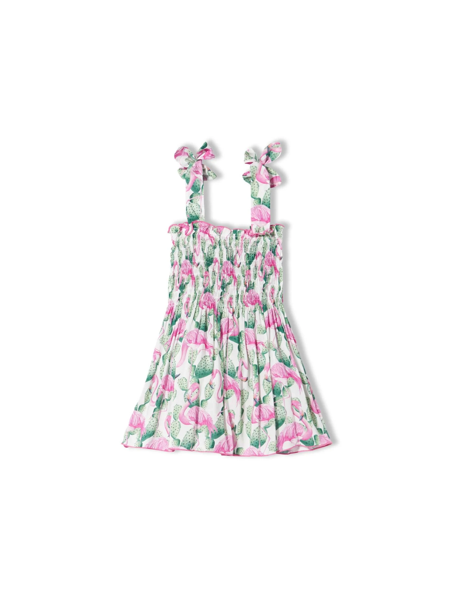 Summer Beach Dress for Little Girl, soft cotton muslin, flamingo all over print, fixed shoulder straps, elastic neckline, knee lenght dress. Composition: 100% Cotton.