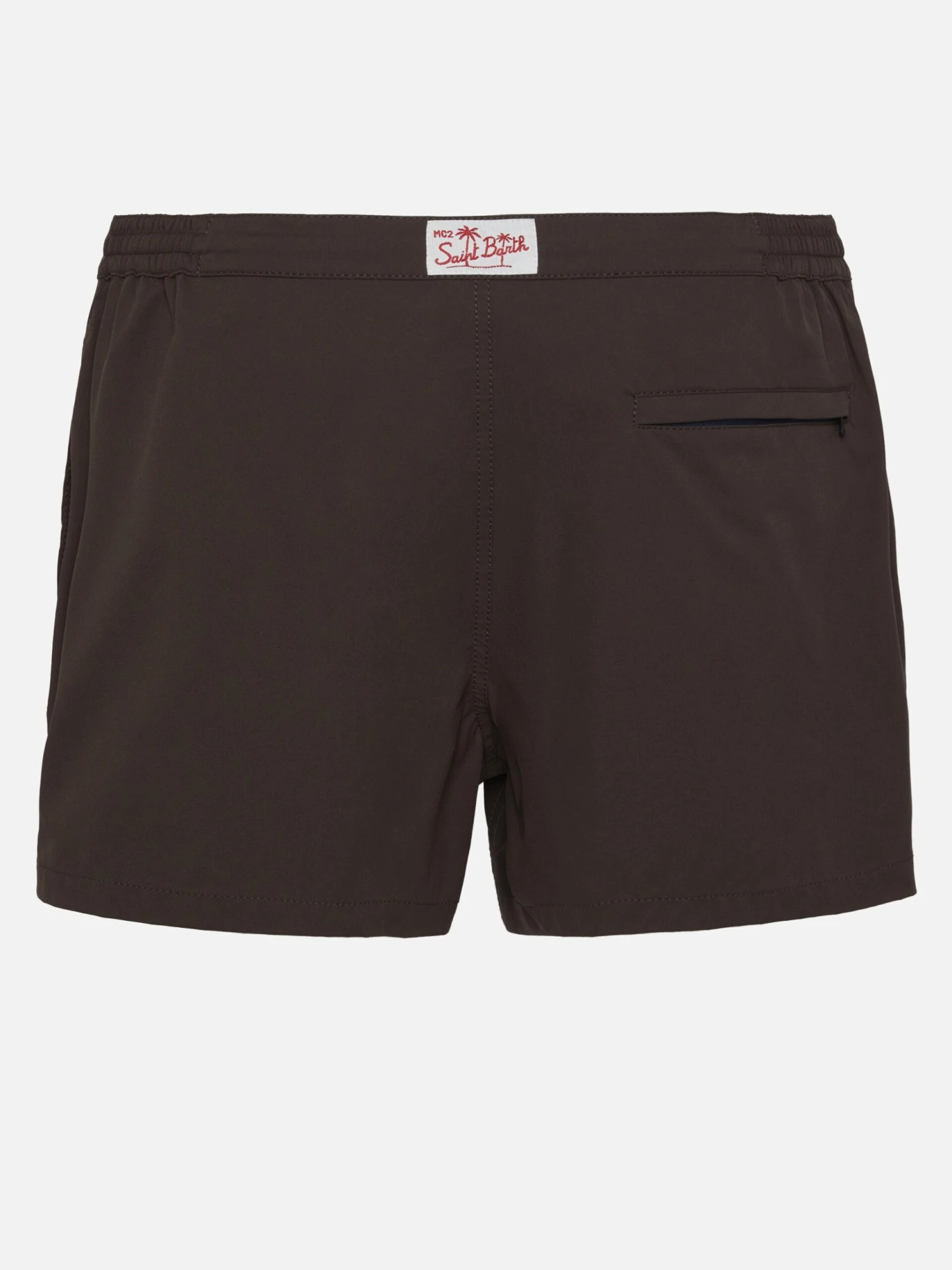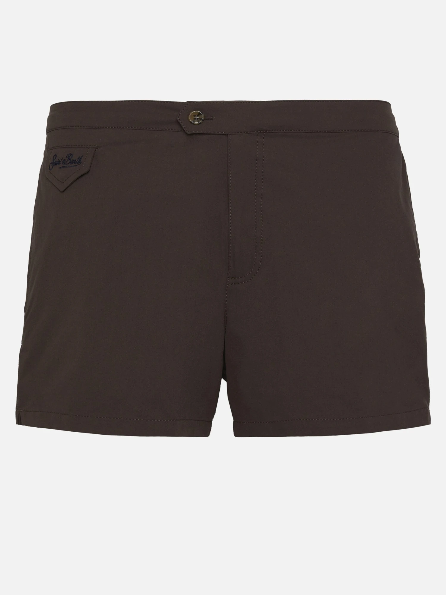 Step into timeless elegance with the iconic St. Barth’s model, Harrys. This swimwear piece seamlessly blends the sophistication of Mediterranean style with a cosmopolitan flair, thanks to its slightly shorter leg length, fitted cut and fixed waistband with elasticized sides, which ensures a secure yet flexible fit. The front closure, adorned with a branded summary and internal counter-summary, conceals a hidden zipper and contrast-colored drawstring, adding a touch of refinement. A distinctive front money pocket, complete with an embroidered Saint Barth logo, combines practicality with elegance. Side pockets and a zippered back pocket offer convenient storage