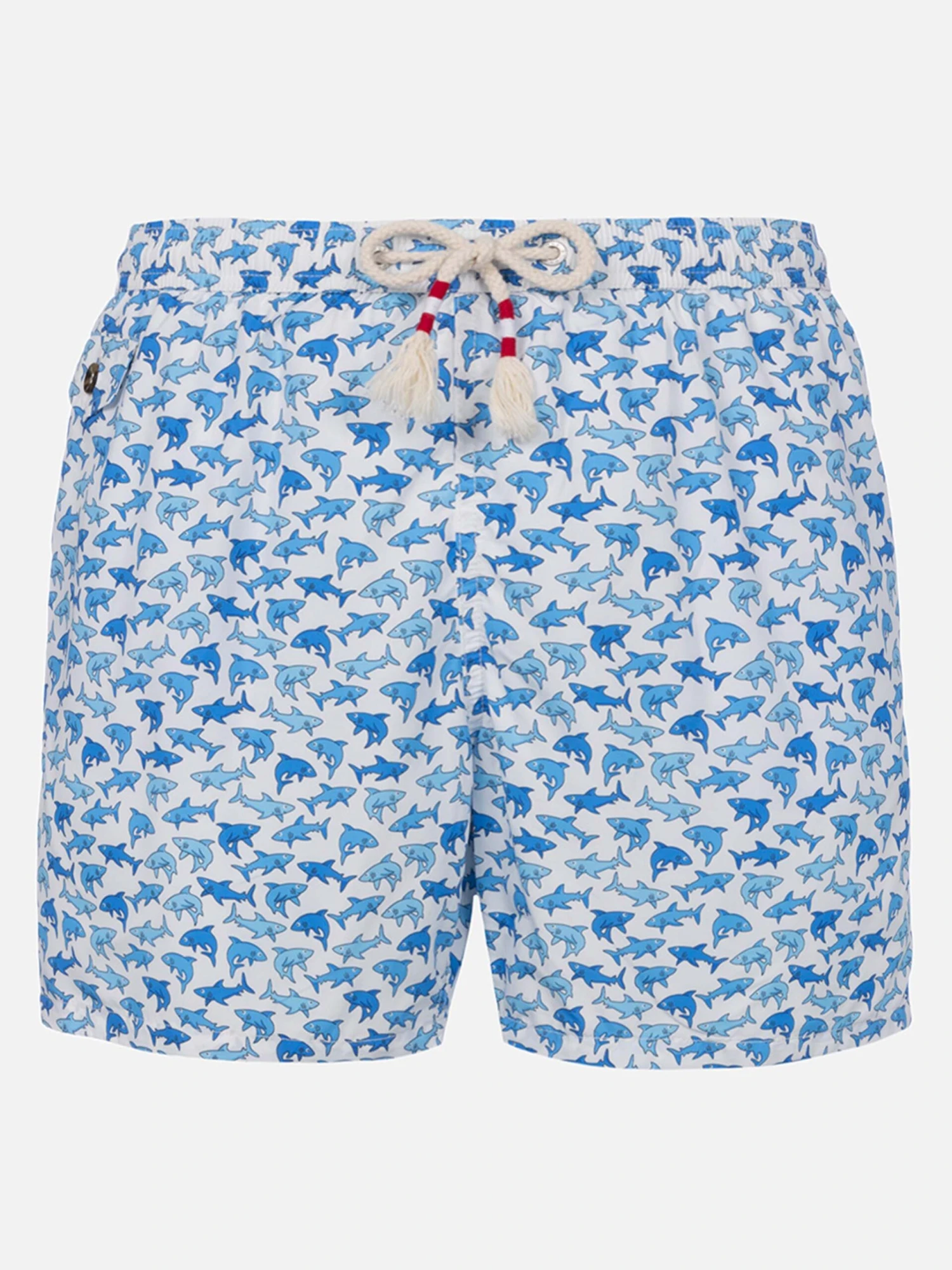 Man Lighting 70 mid-length swim shorts are crafted from quick-drying fabric, inspired by the elegance of the ’70s with maiolica and gipsy prints. The elasticized waistband ensures comfort, while branded eyelets aid water drainage. A white rope drawstring with red thread tip enhances the retro feel. Featuring side pockets, a back patch pocket with summary closure, and an internal coin pocket for practicality. Made from 100% recycled polyester, reflecting our commitment to sustainability.