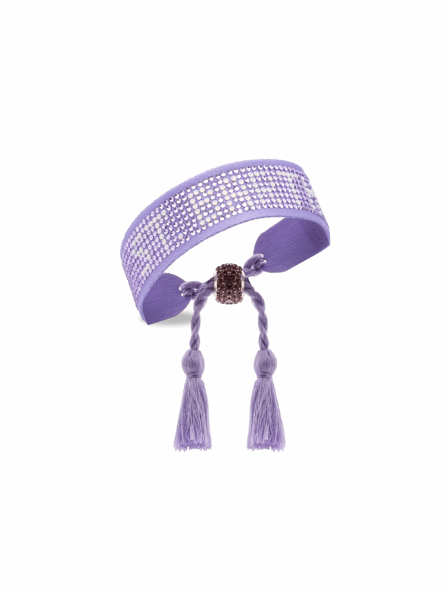 A delicate bracelet made of lilac rhinestones featuring the word St. Barth in raised silver lettering. Two lilac tassels at the clasp add a touch of movement and lightness to this piece. Perfect for a casual yet chic style.