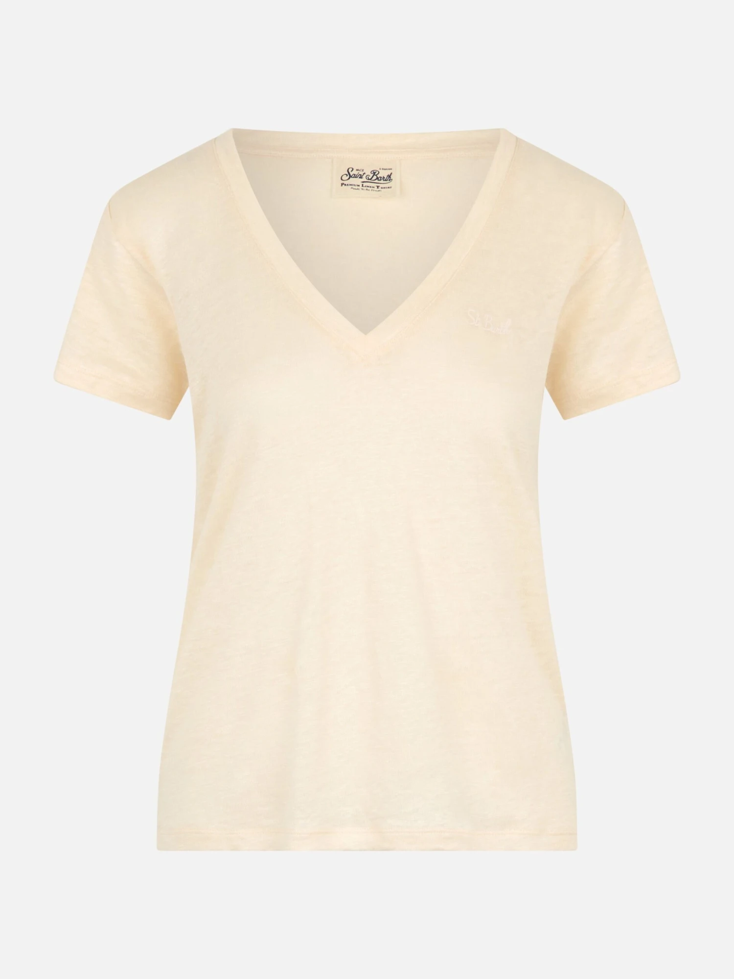 Designed with a loose and comfortable silhouette, this V-neck t-shirt is crafted from lightweight linen jersey and features our distinctive embroidered Saint Barth logo placed above the heart.