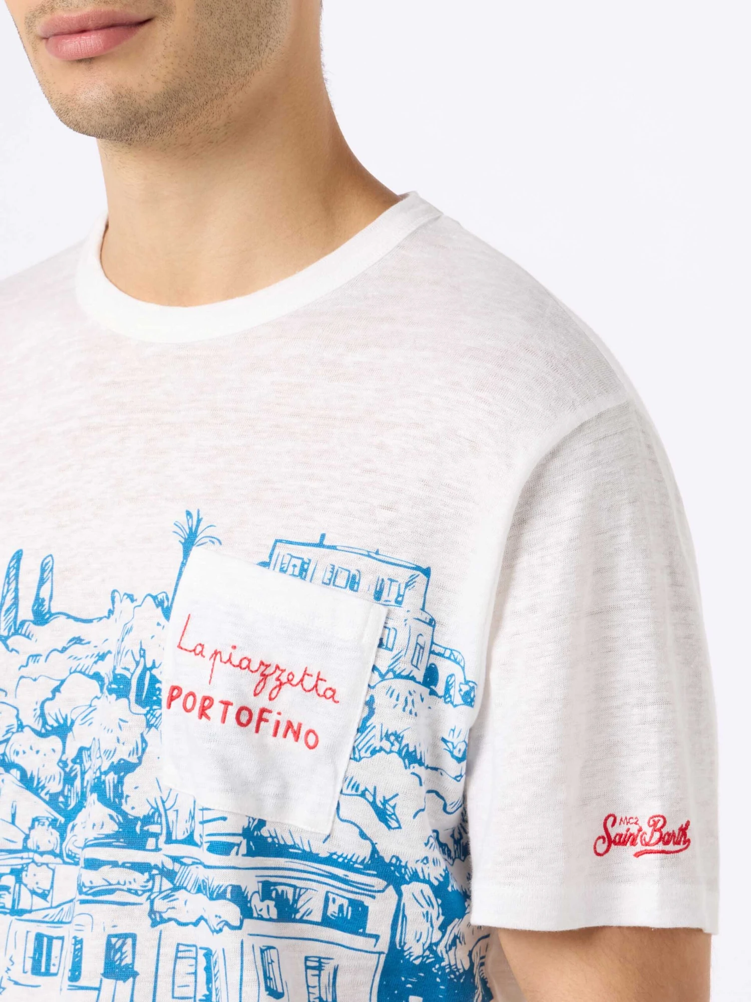 MC2 Saint Barth Man Linen Jersey T-shirt Ecstasea With Portofino Placed Print And Embroidered Pocket