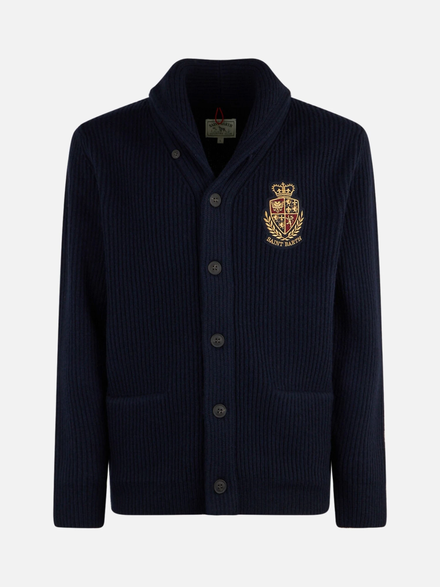 MC2 Saint Barth Man Shawl Collar Blue Ribbed Cardigan With Pockets And Patch