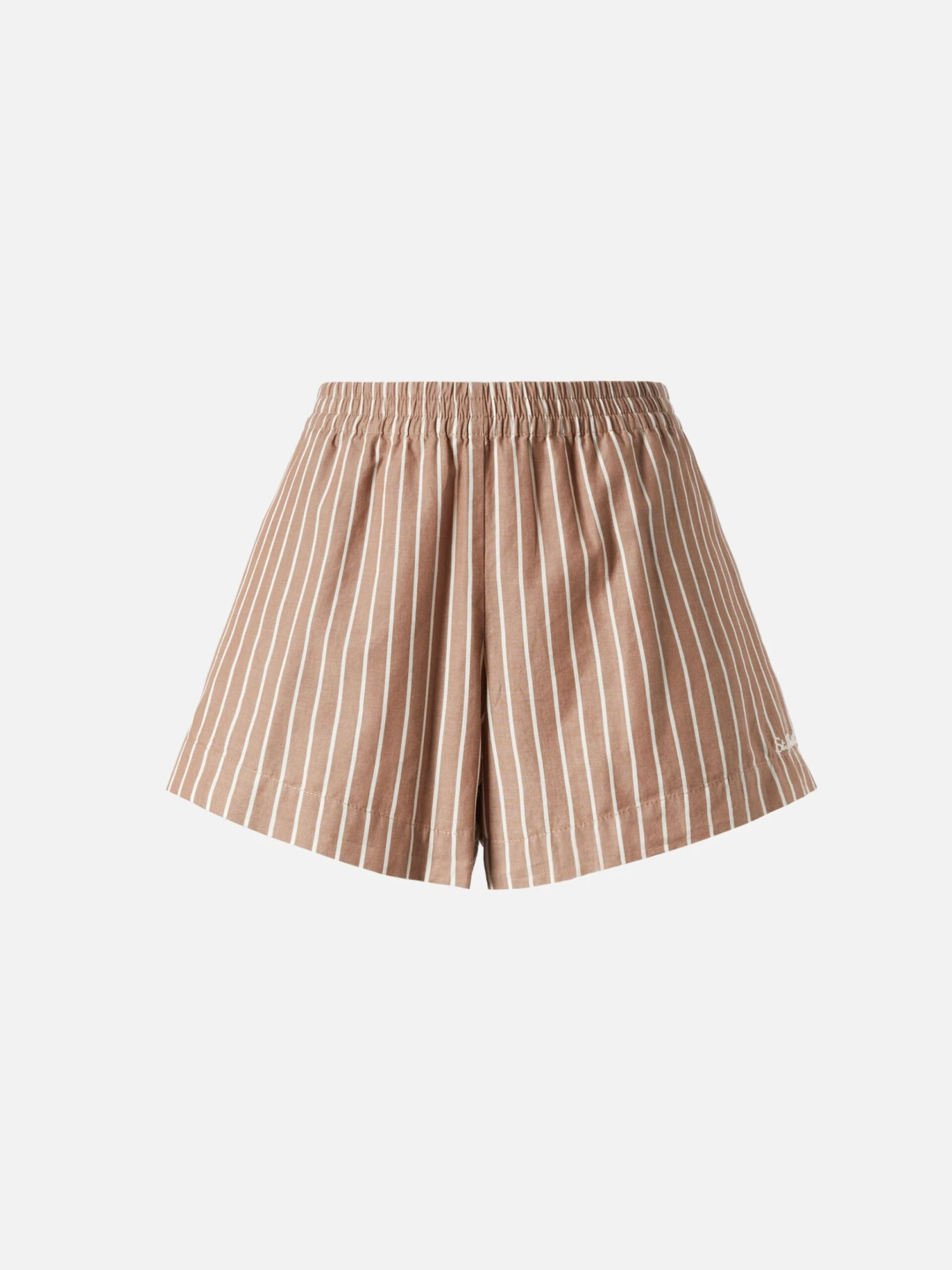 This modern iteration of the boxing short is crafted with soft linen and designed for a relaxed silhouette. Designed to hit at the upper thigh. Size S has a 33,5 cm rise (relaxed elastic) and 33 cm thigh width. You can pair them with the matchy Meredith shirt