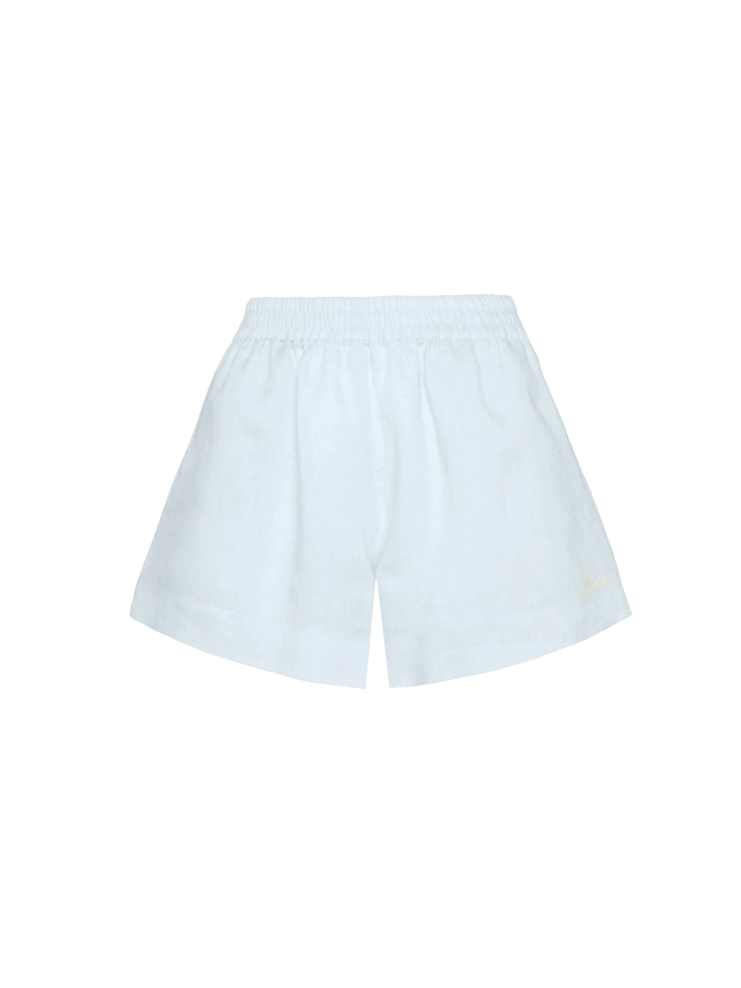 This modern iteration of the boxing short is crafted with soft linen and designed for a relaxed silhouette. Designed to hit at the upper thigh. Size S has a 33,5 cm rise (relaxed elastic) and 33 cm thigh width. You can pair them with the matchy Meredith shirt