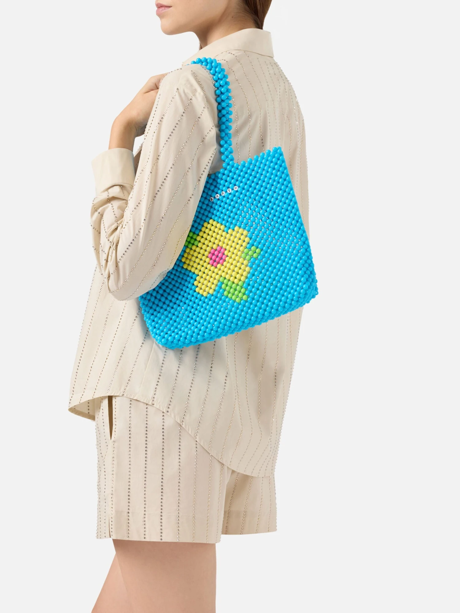 Introducing our Beaded Shopper Bag – a charming accessory that seamlessly blends style and functionality. This petite bag, intricately crafted entirely from vibrant beads, is not only a visual delight but also a practical companion for your essentials, including your smartphone. The stunning design features a myriad of color combinations, creating a playful and eye-catching aesthetic. The meticulous beadwork adds a touch of sophistication to this small yet statement-making accessory. The bag is equipped with a convenient handheld handle, allowing for easy carrying and adding an elegant touch to your ensemble. Perfectly sized to accommodate your smartphone and other small necessities, this Beaded Small Bag is a versatile addition to your wardrobe. Elevate your look with its unique craftsmanship and showcase your individuality with the array of colors that adorn this delightful accessory.
