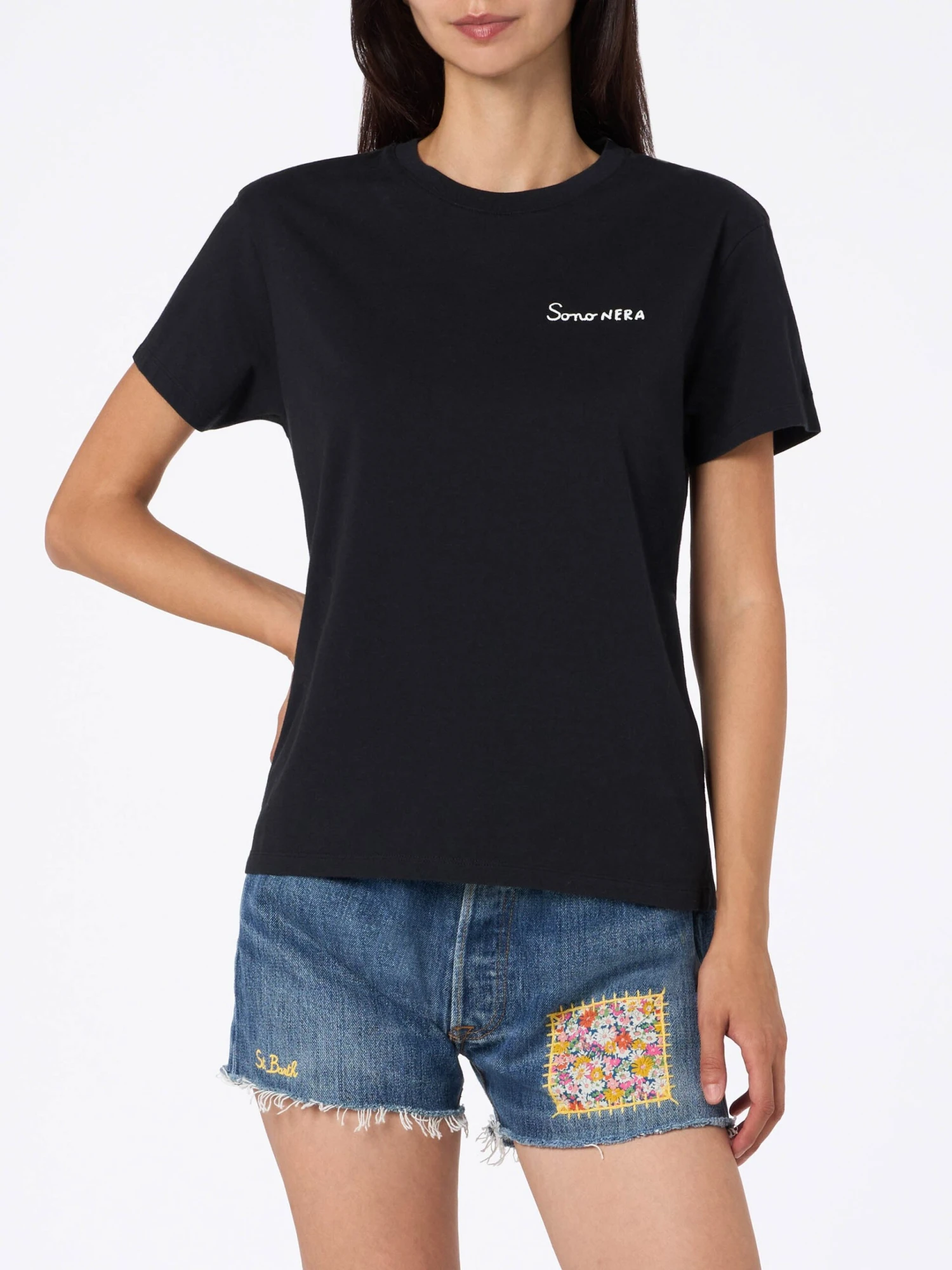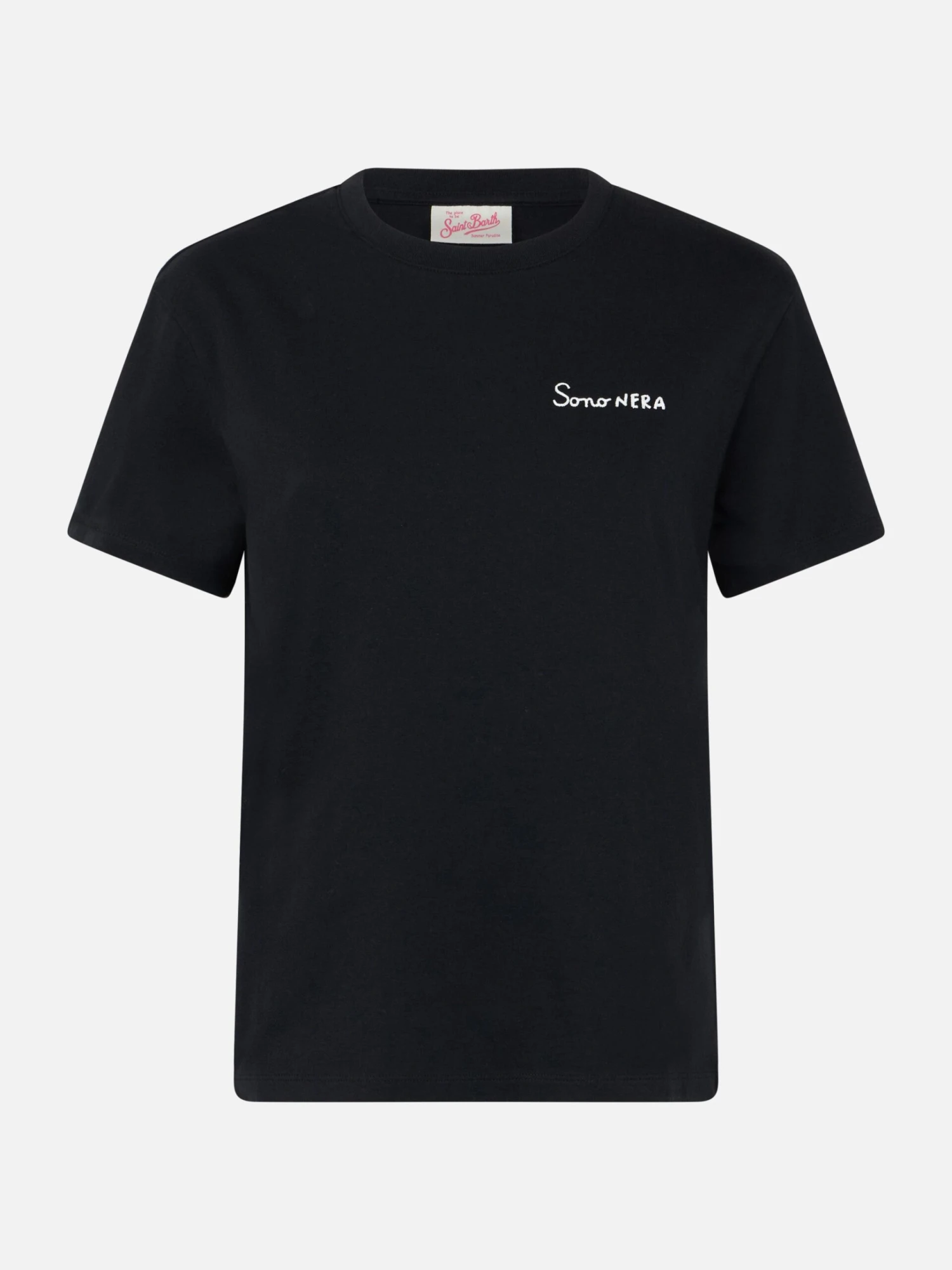 MC2 Saint Barth Woman Black Cotton Jersey Crewneck T-shirt Emilie With Sono Nera Embroidery