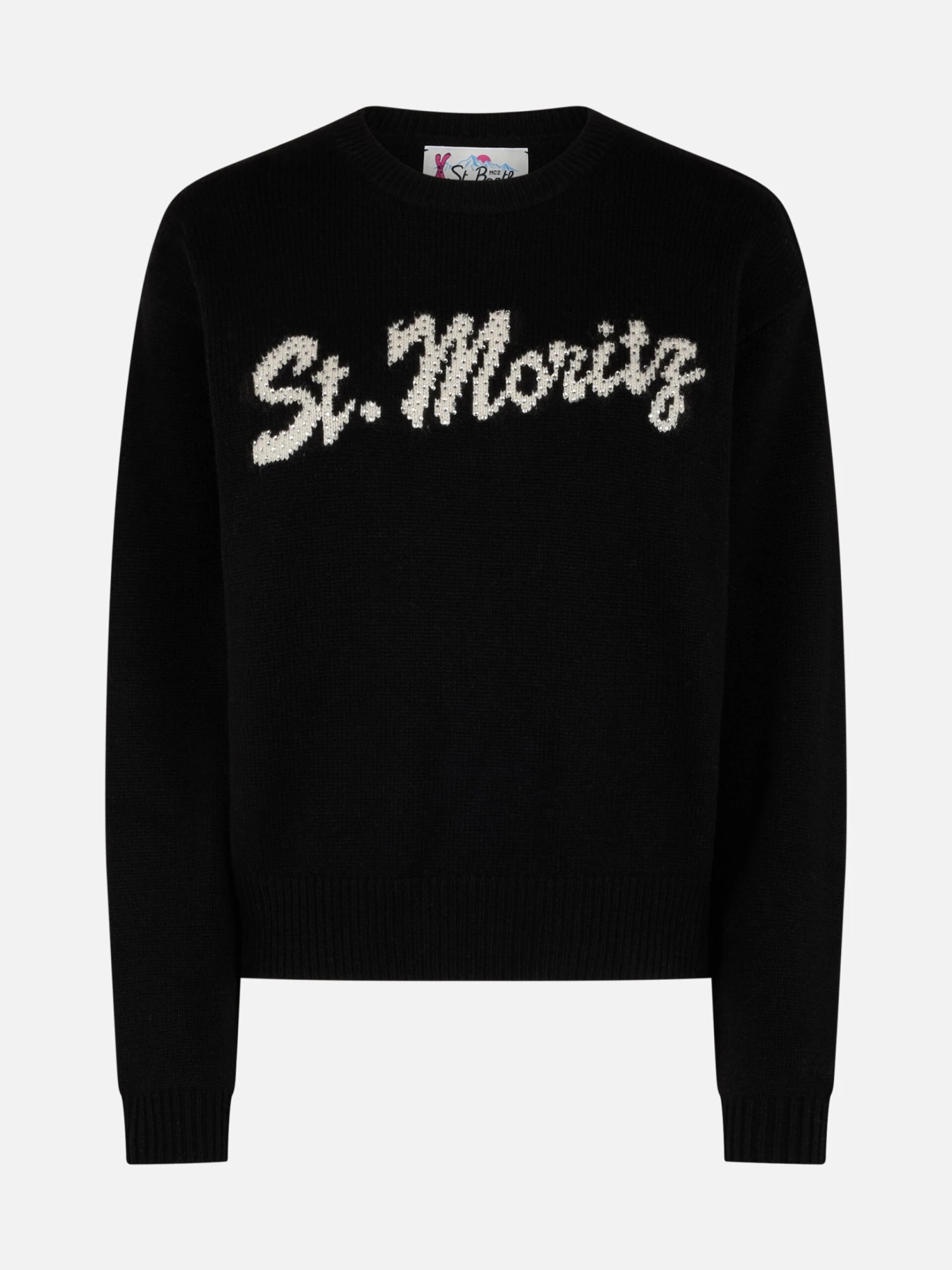 MC2 Saint Barth Woman Black Sweater Louise With St. Moritz Rhinestones Embellishment | ST. MORITZ TOP OF THE WORLD SPECIAL EDITION