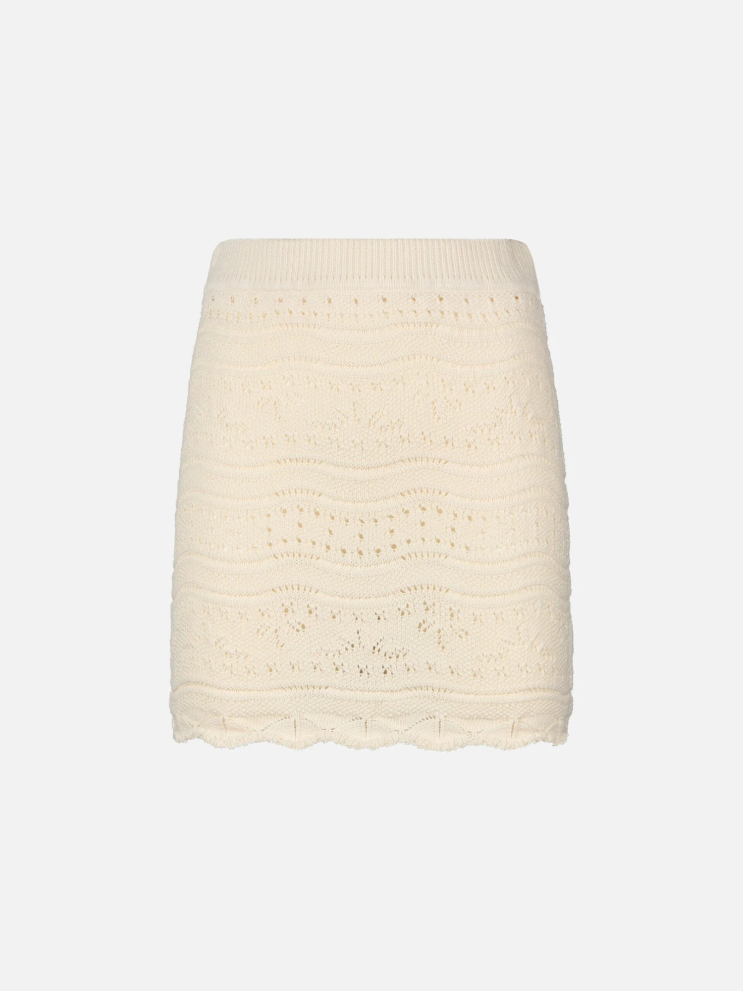This ivory skirt is knitted with airy lace patterns throughout, then finishes the cuffs and midi hem with charming scallops. It’s the perfect garment to enance your femininity with ease and comfort