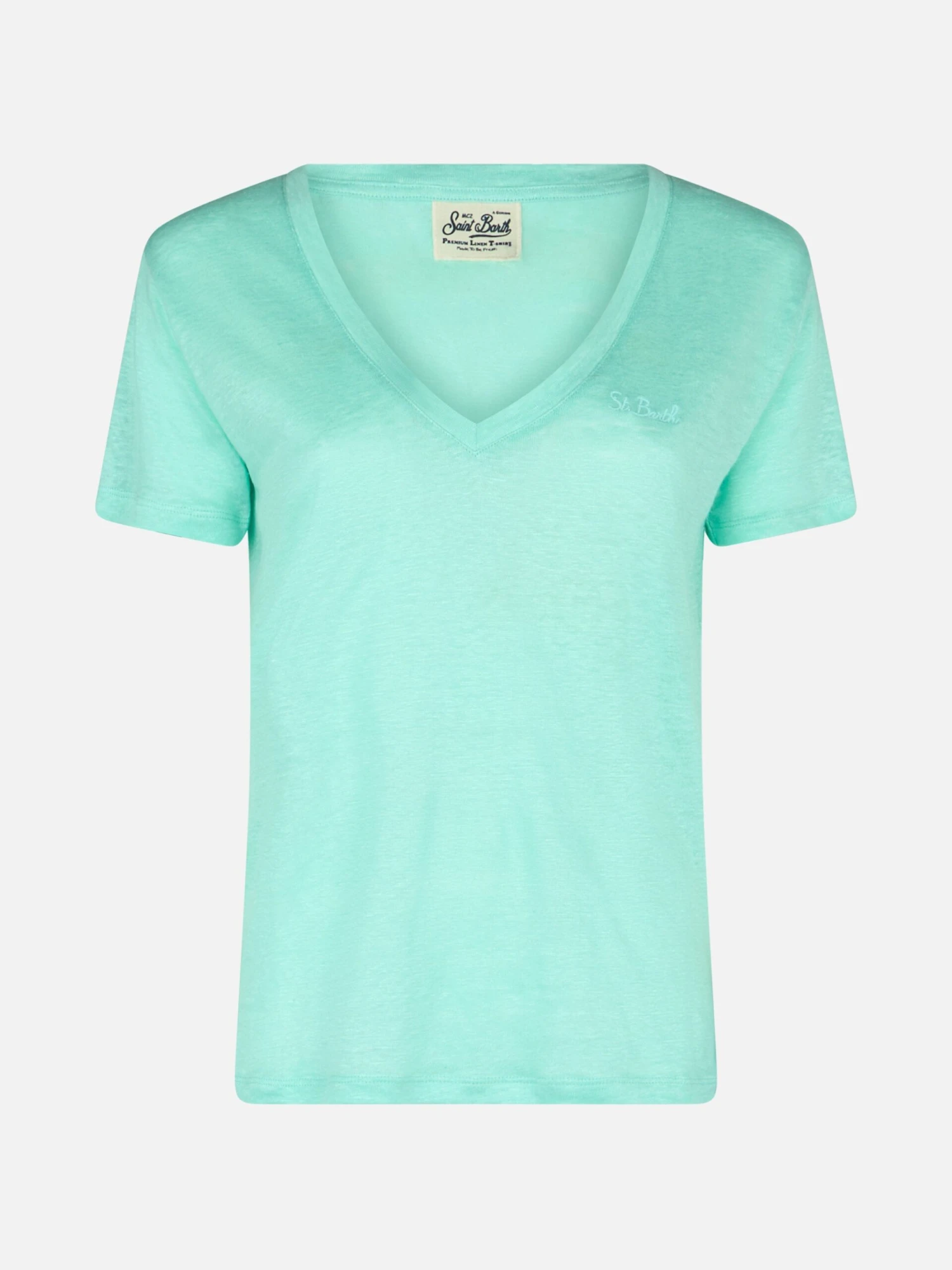 Designed with a loose and comfortable silhouette, this V-neck t-shirt is crafted from lightweight linen jersey and features our distinctive embroidered Saint Barth logo placed above the heart.