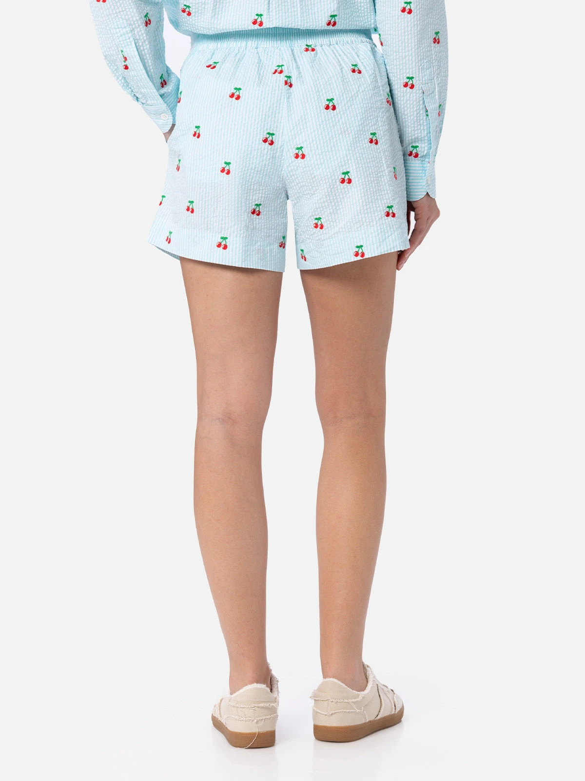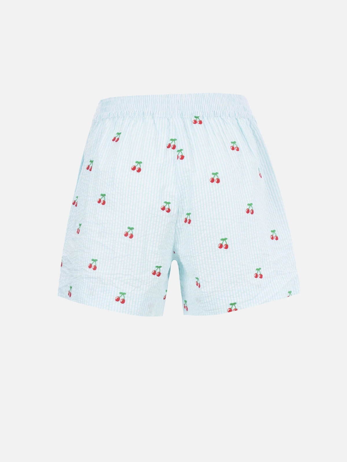 MC2 Saint Barth Woman Seersucker Striped Pull Up Shorts Meave With Cherry Patches