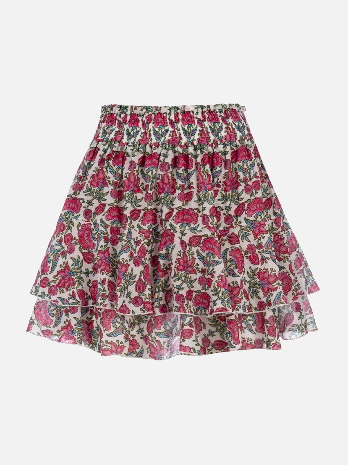 Soft pleats, scalloped hems and a wavy graphic emphasize the dynamism of this lively mini skirt. Crafted from cotton and silk, the piece is colored with pink tones and features a floral indian-style print. This product, along with many other MC2 Saint Barth items, is created with an all-over print that falls differently on each garment.