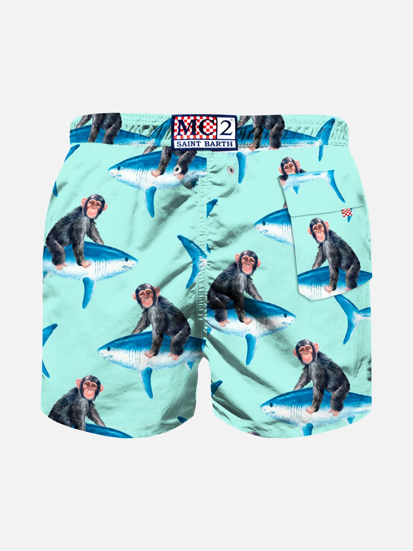 Boy’s mid-length swimshorts, monkeys riding on sharks all over print on green water backcloth, regular fit, comfortable drawstring waist, inside ergonomic brief, drawcord closure, pockets on both sides, backside classic pocket with velcro closure. Father & Son Collection.