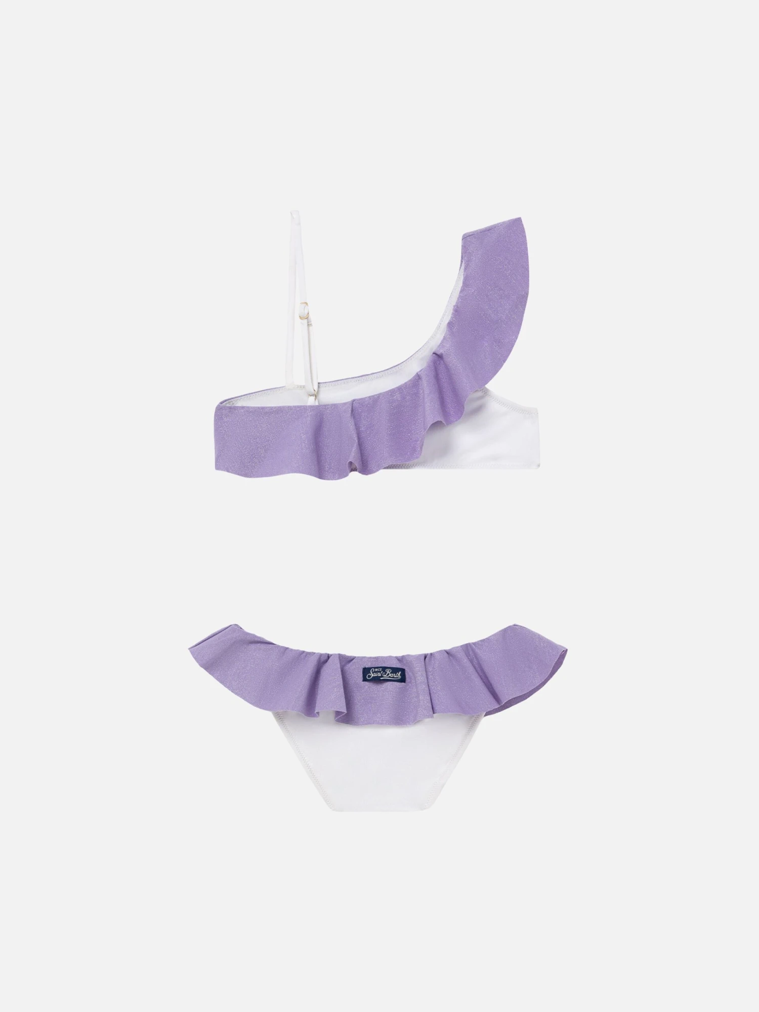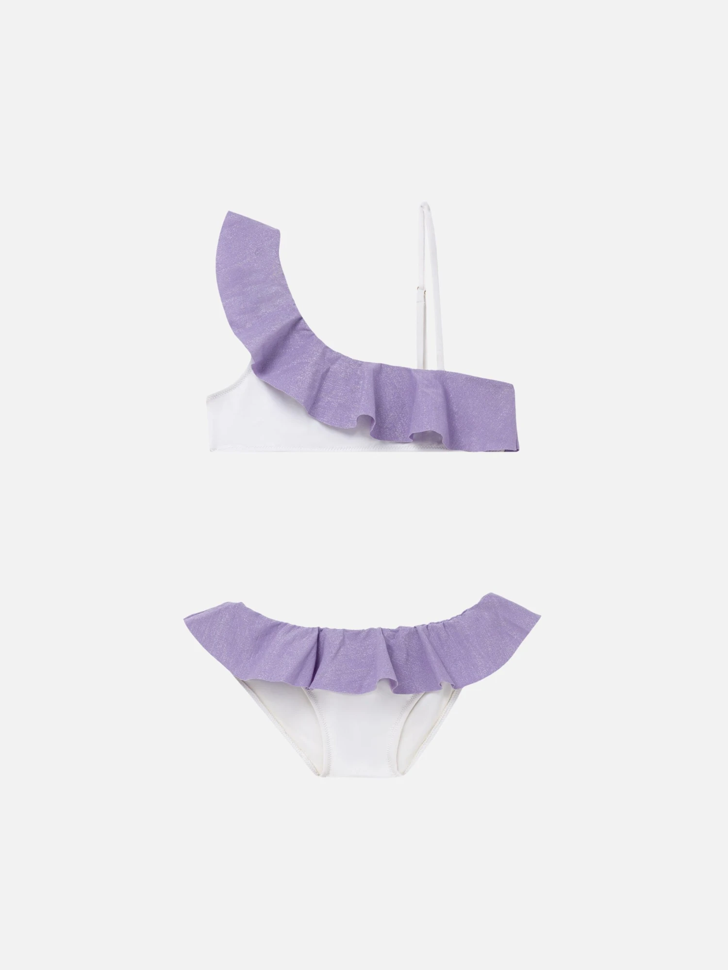 ruffle, white color with lilac glitter ruffles, stretch fit, regular fit. Composition: 90% Polyamide 10% Elastane