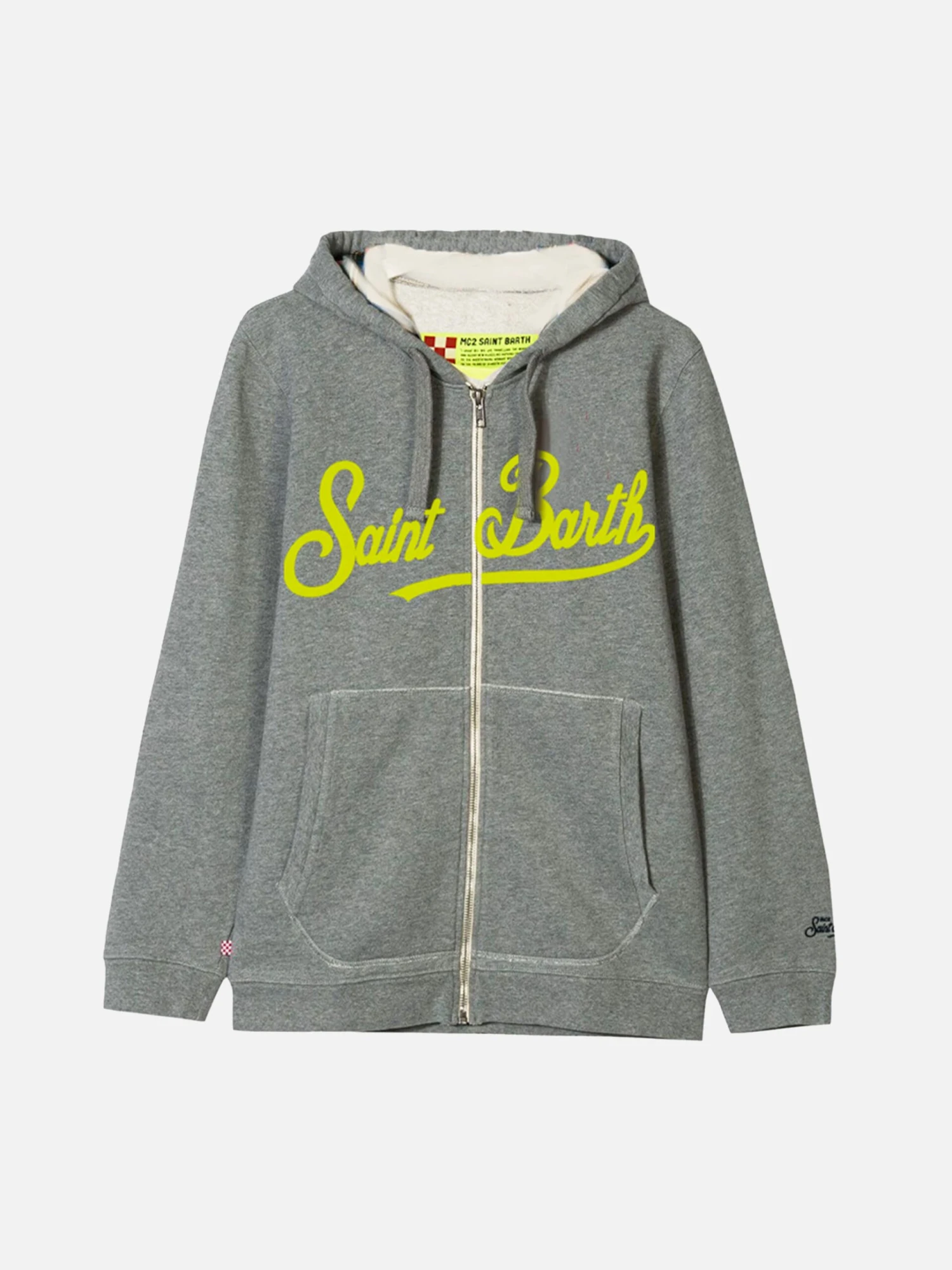 Boy’s grey hoodie, cotton fabric, Saint Barth flocked yellow fluo front graphic, long sleeves, fron zip closure, two front pockets. 100% warm cotton fleece, ribbed collar and cuffs.