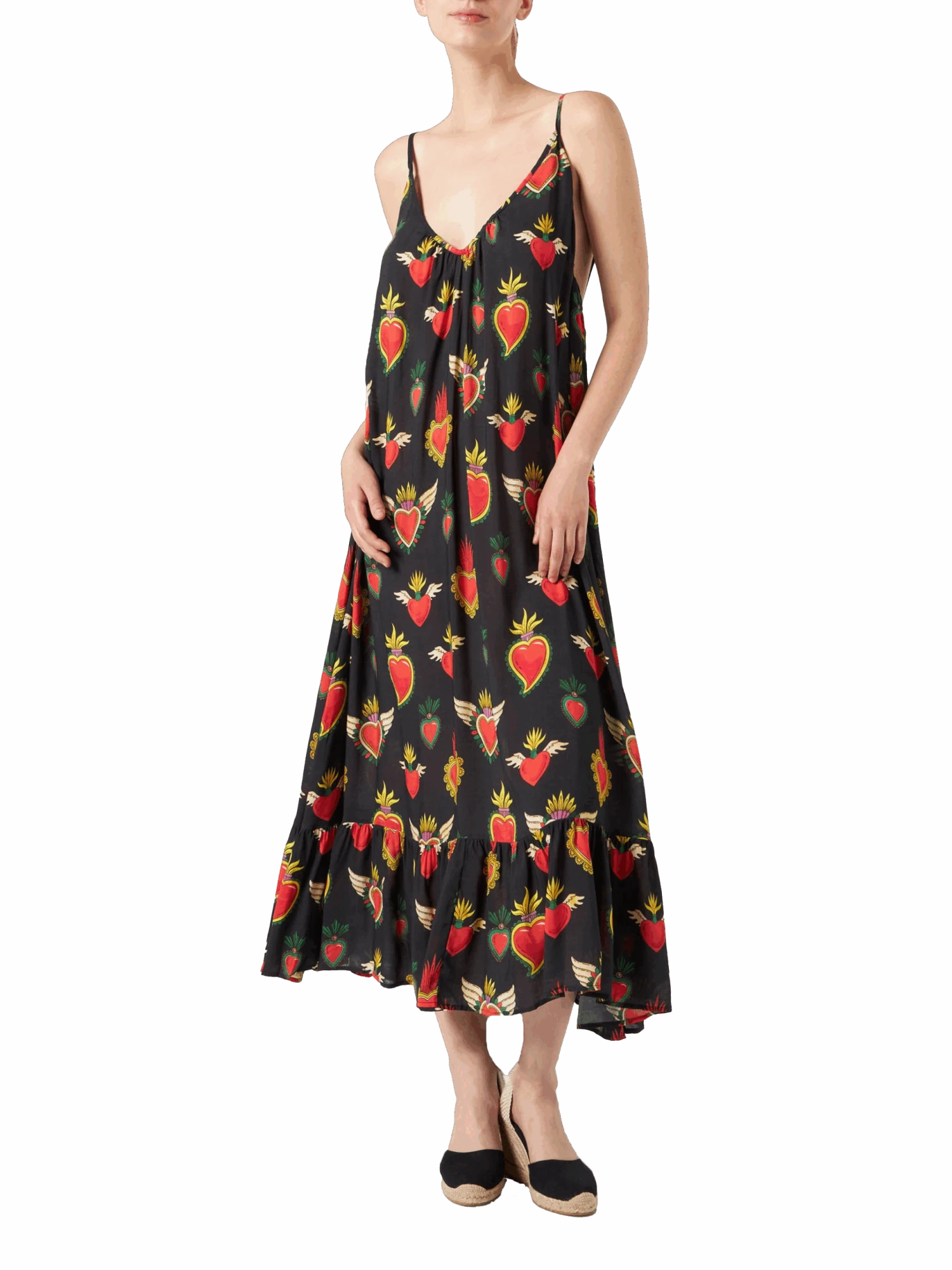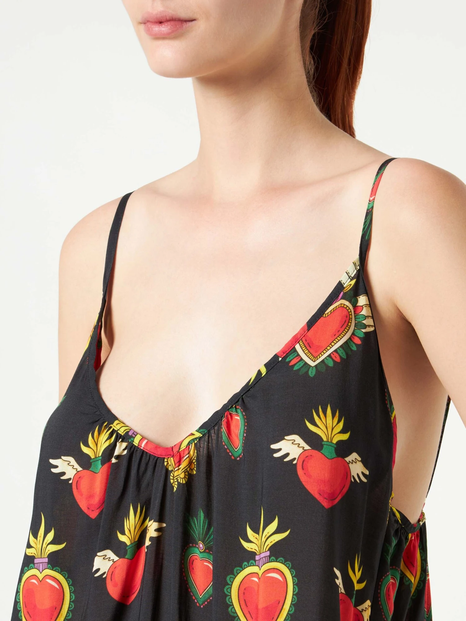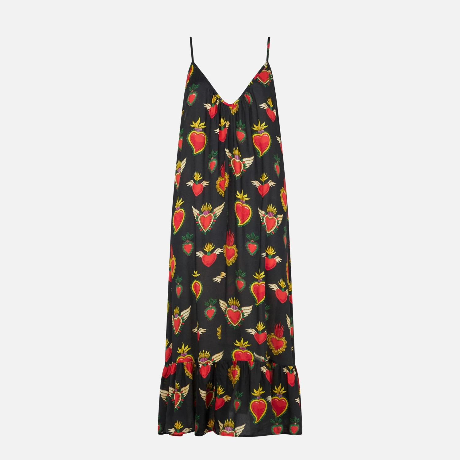 Iconic secret heart print gown, flownce on the bottom, shoulder straps, deep neckline on the back, multicolor heart print, black backcloth, 100% viscose.