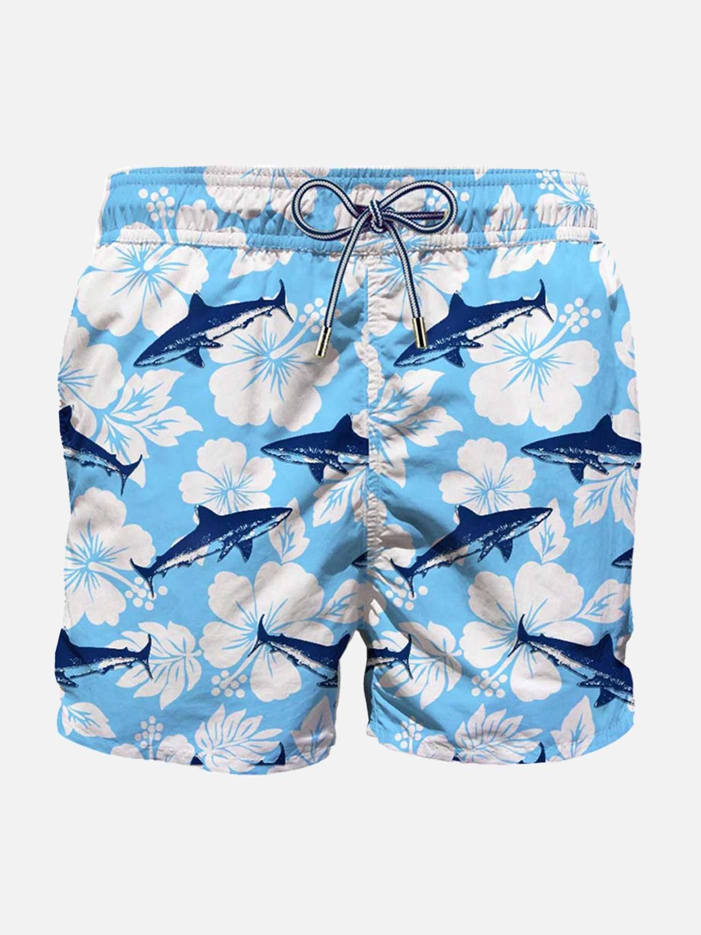 White hibiscus print on light blue backcloth, dark blue velvet sharks pattern, mid-length swim short, regular fit, microfiber fabric, drawcord closure, inside ergonomic brief, pockets on both sides, backside classic pocket with velcro closure.