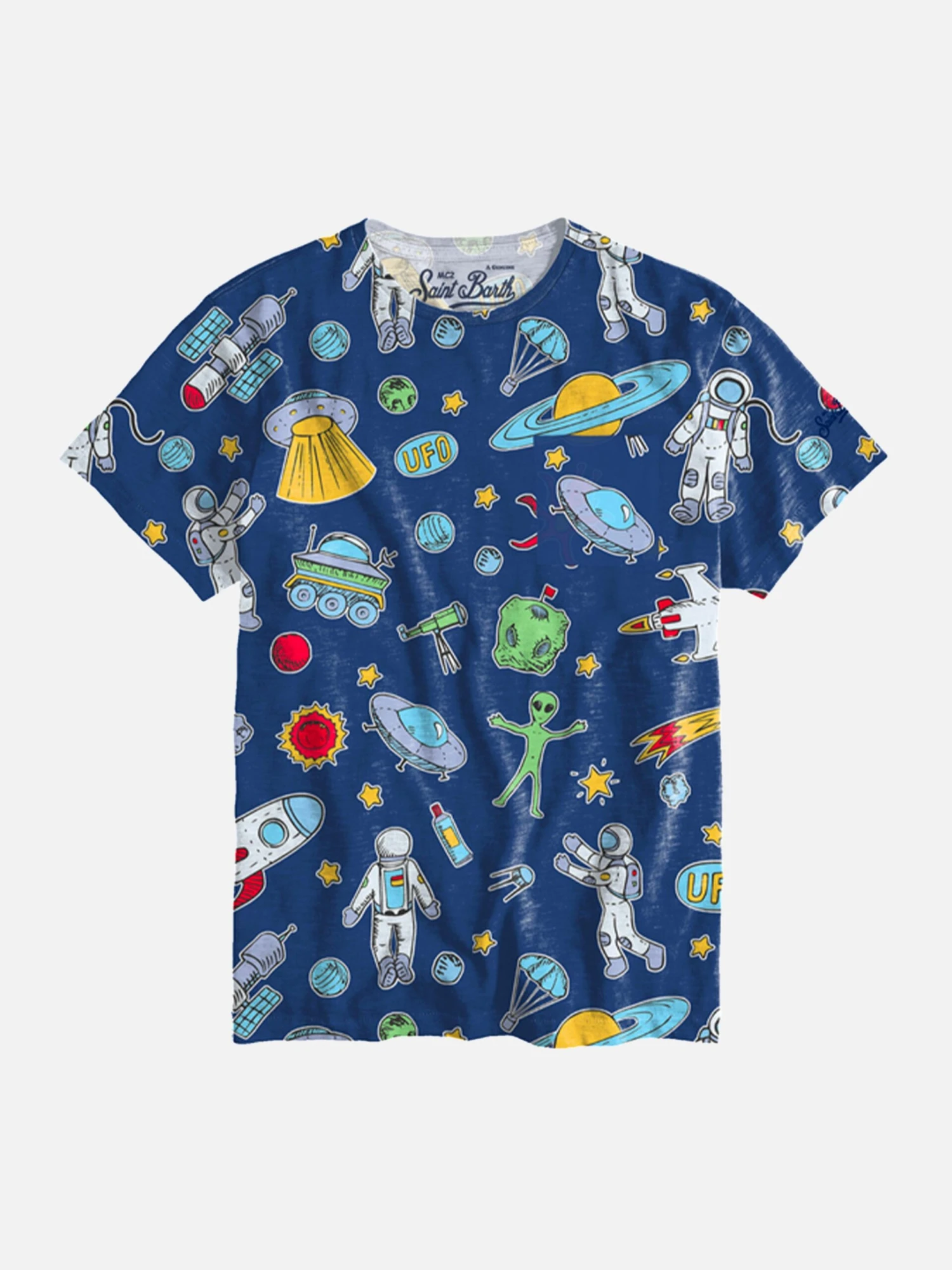 Cotton t-shirt for boy, space and astronauts pattern all over print on blue backcloth, regular fit, round necked, soft cotton, short sleeve, styled in St. Barth. Composition 100% Cotton. Made in Italy.