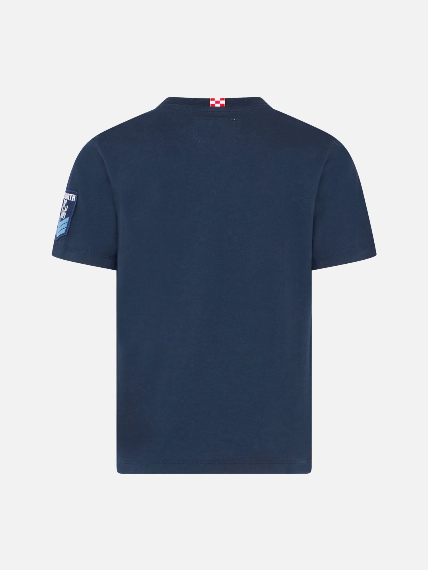 Boy’s T-shirt, St.Barth Navy front graphic, regular fit, round neckline, blue cotton, short sleevs, styled in St. Barth. Composition 100% Cotton.