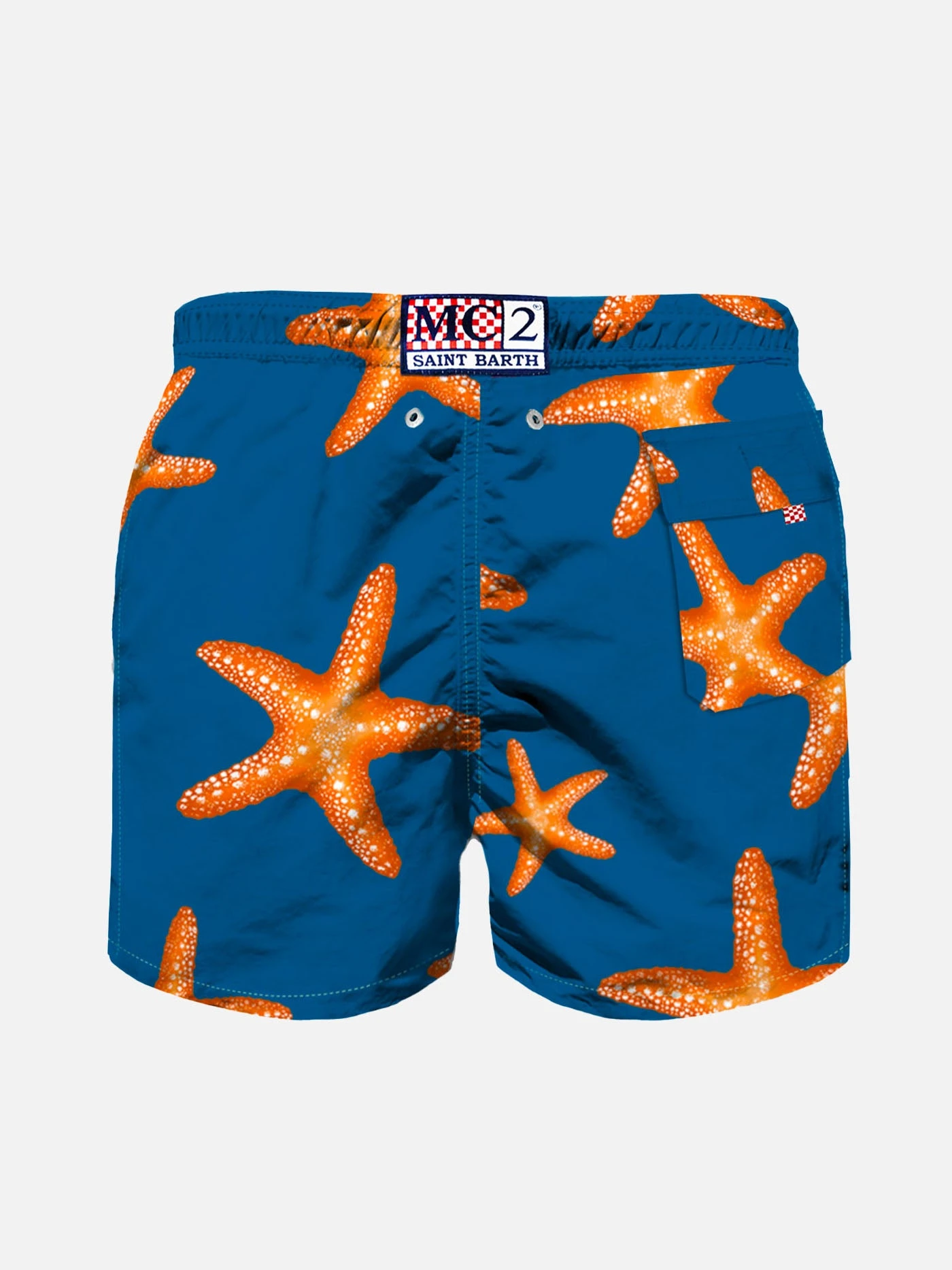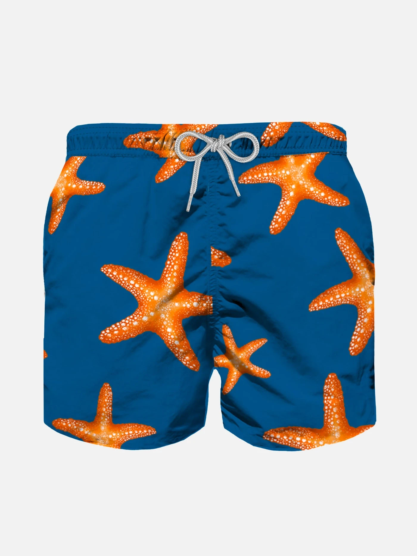 Boy’s Swimshorts, mid-length, orange starfishes all over print on blue backcloth, regular fit, multicolor microfiber, comfortable drawstring waist, inside ergonomic brief, drawcord closure, pockets on both sides, backside classic pocket with velcro closure. Family Collection.