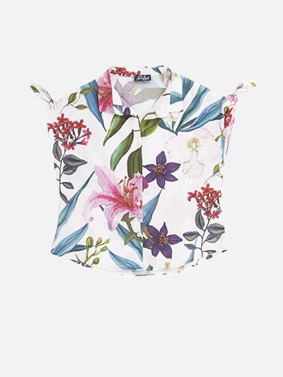 Cotton girl’s shirt dress, tropical flowers all over jumbo pattern, short raglan sleeves with bows, cotton fabric, front summaryed closure, classic neck.