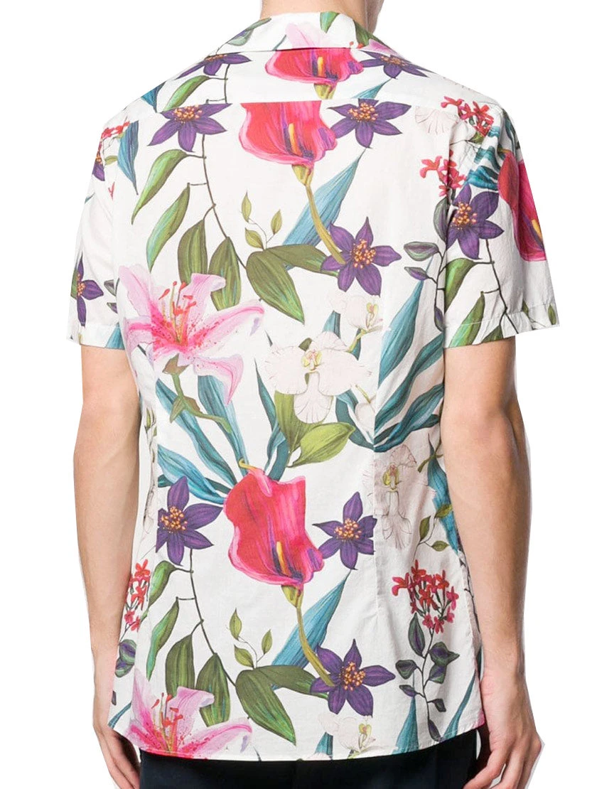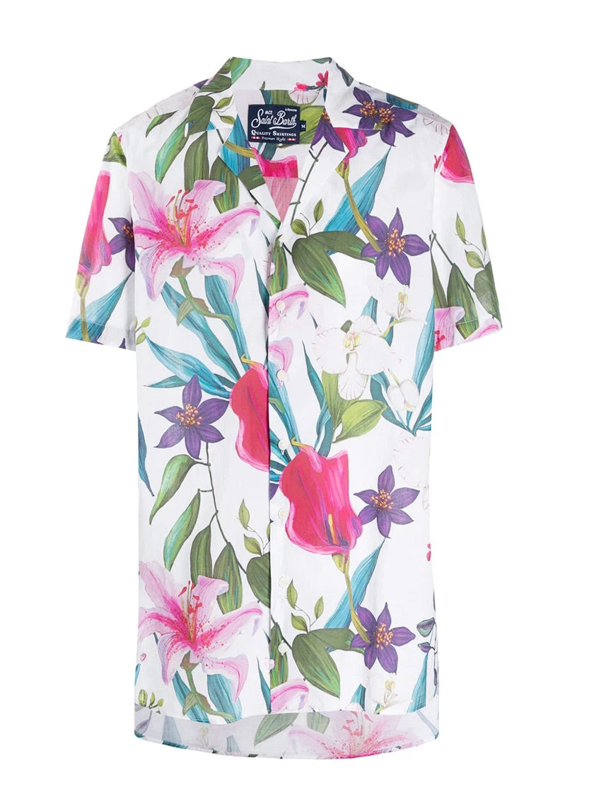 100% Cotton Man Shirt, tropical leaves and flowers jumbo print, white backcloth, regular fit, short sleeves, classic neckline, front closure, no pockets. Casual St. Barth shirt. Made in Italy.